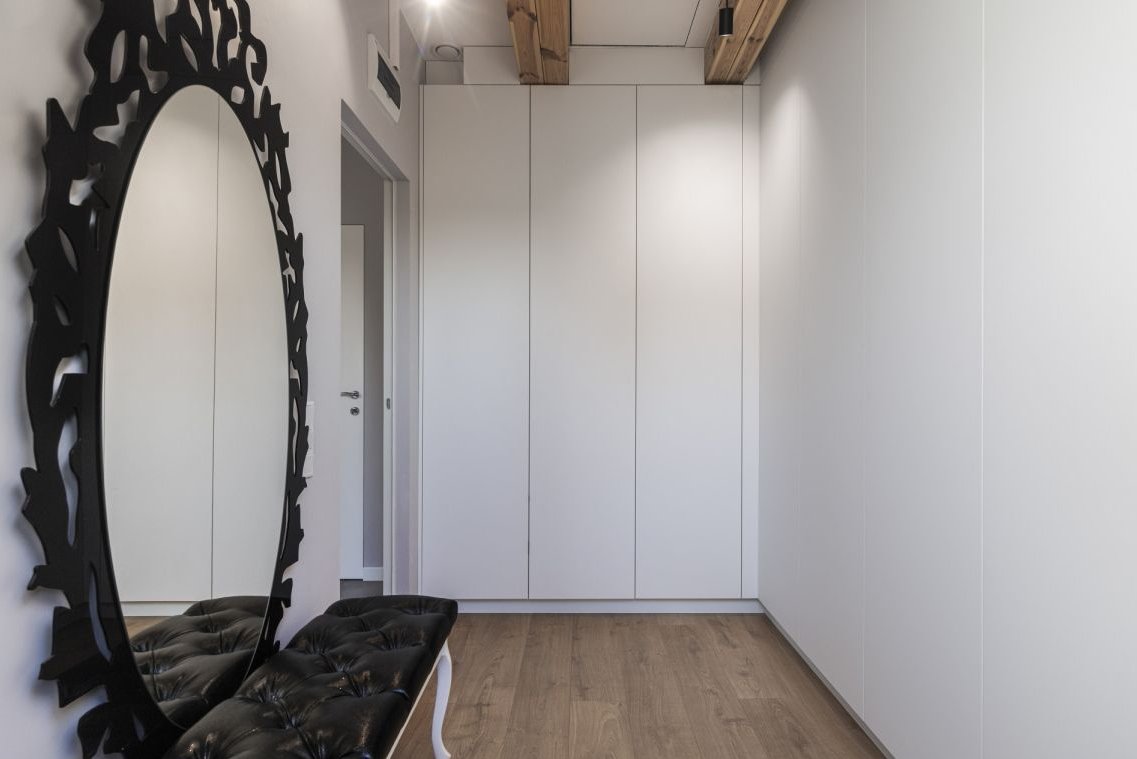 - wiatrołap i korytarz: Meble na wymiar, tynk strukturalny, szafa z lustrami. Szklane drzwi pełnią rolę bariery termicznej, optycznie powiększając wnętrze.