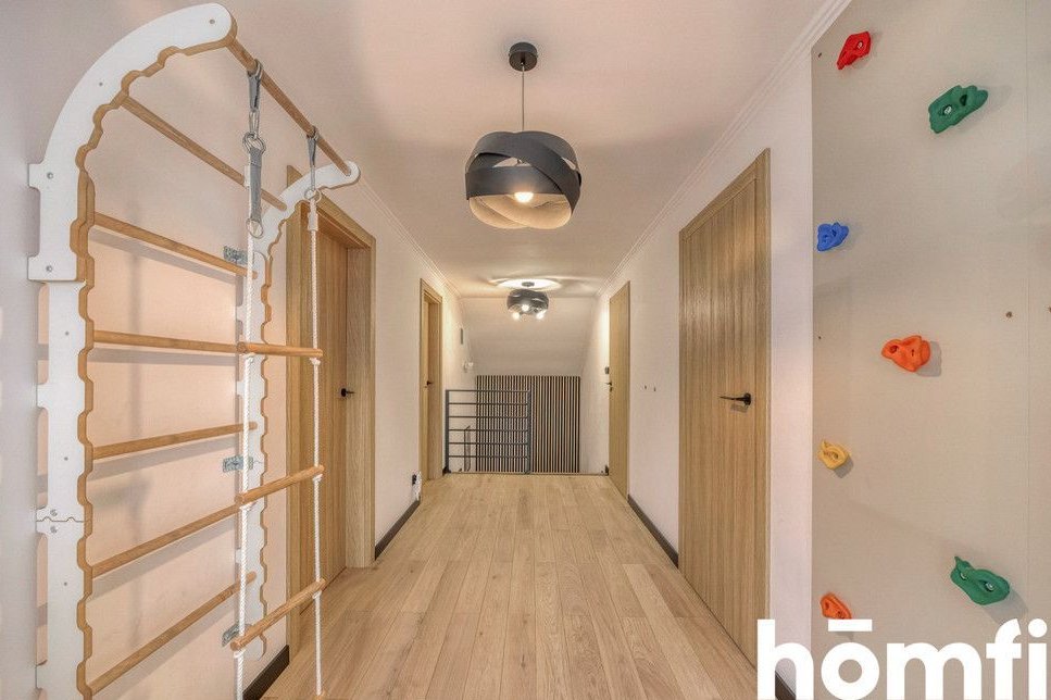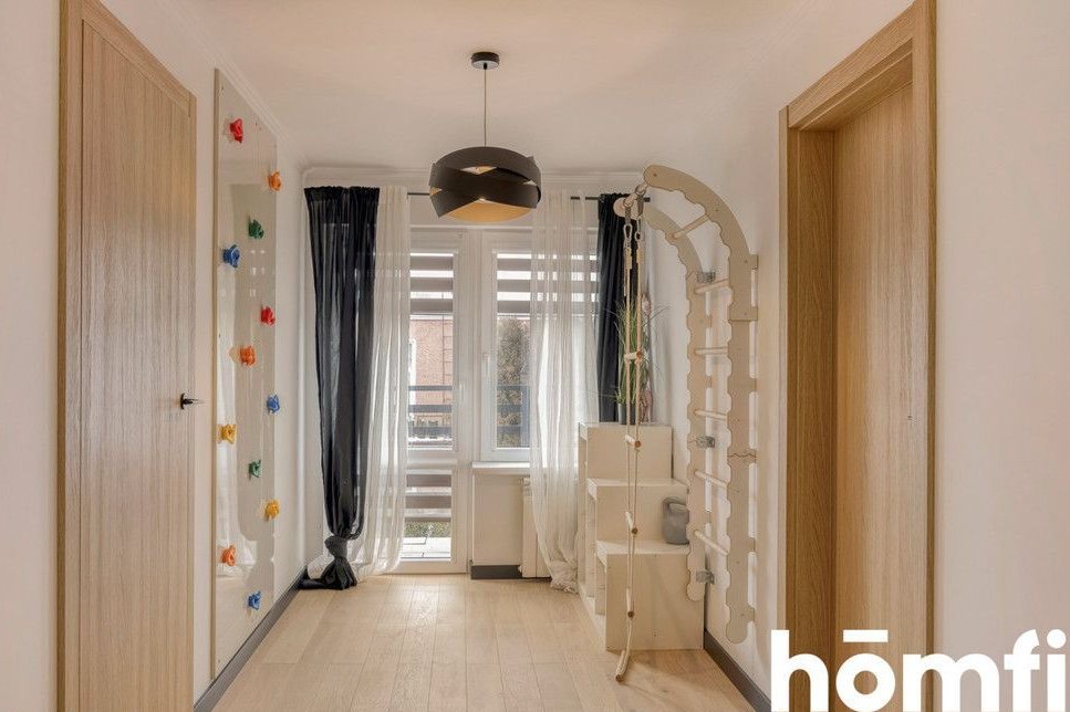 ✔ Przestronny hall – 11,25 m² ze ścianą wspinaczkową dla dzieci oraz z wyjściem na balkon (2,5 m²)