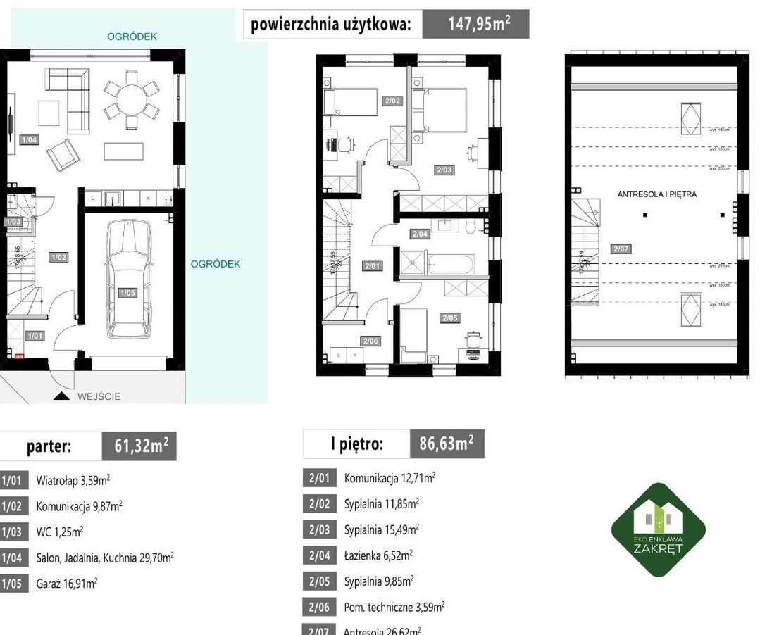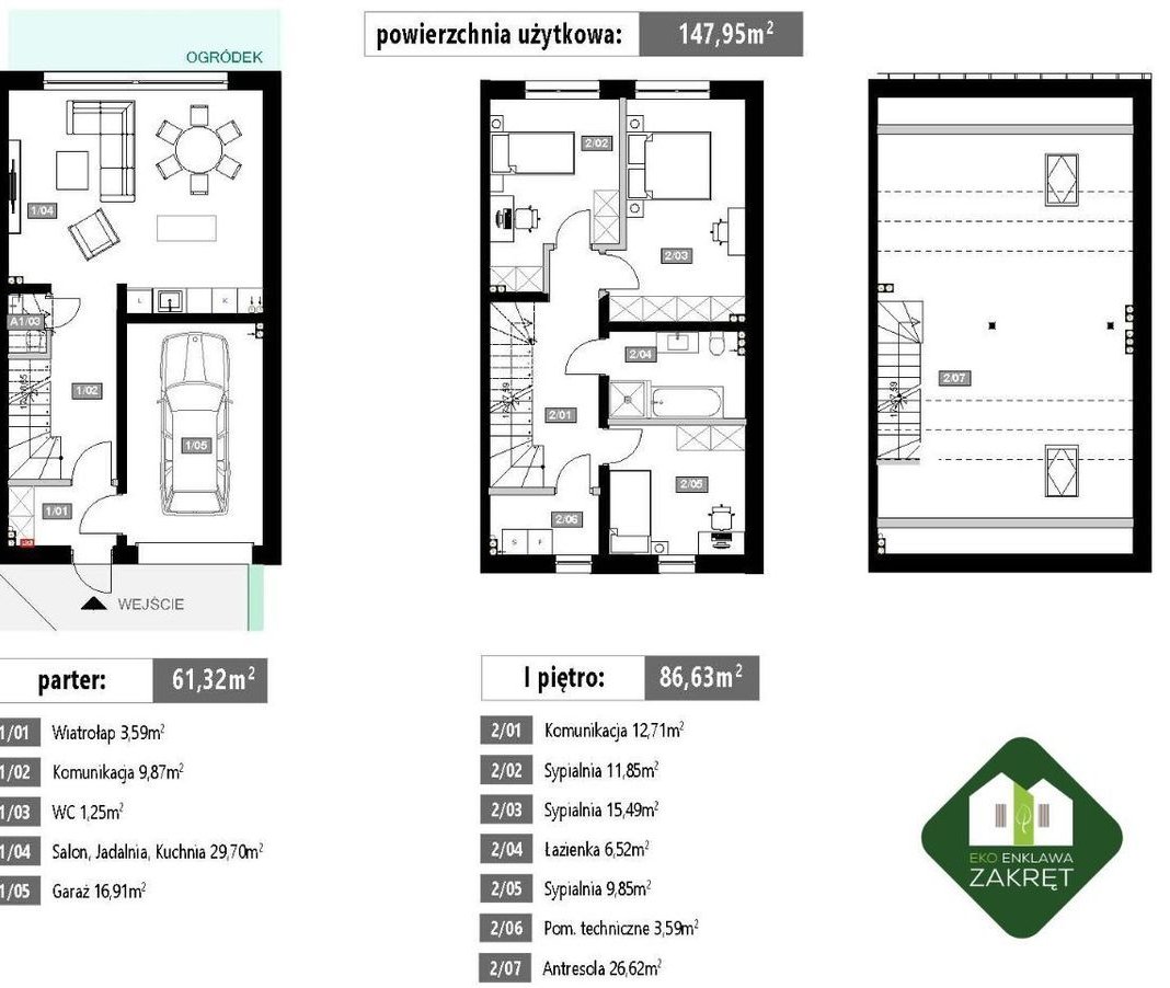 Nowoczesne osiedle składa się z 9 domów w zabudowie bliźniaczej - każdy budynek o powierzchni 148,44 m2 posiada własny ogródek od 54-124 m2. Eko Enklawa Zakręt powstaje z myślą o komforcie użytkowników i z troską o środowisko. Stosujemy wysokiej jakości materiały, domy będą przystosowane do ekonomicznych i ekologicznych instalacji.