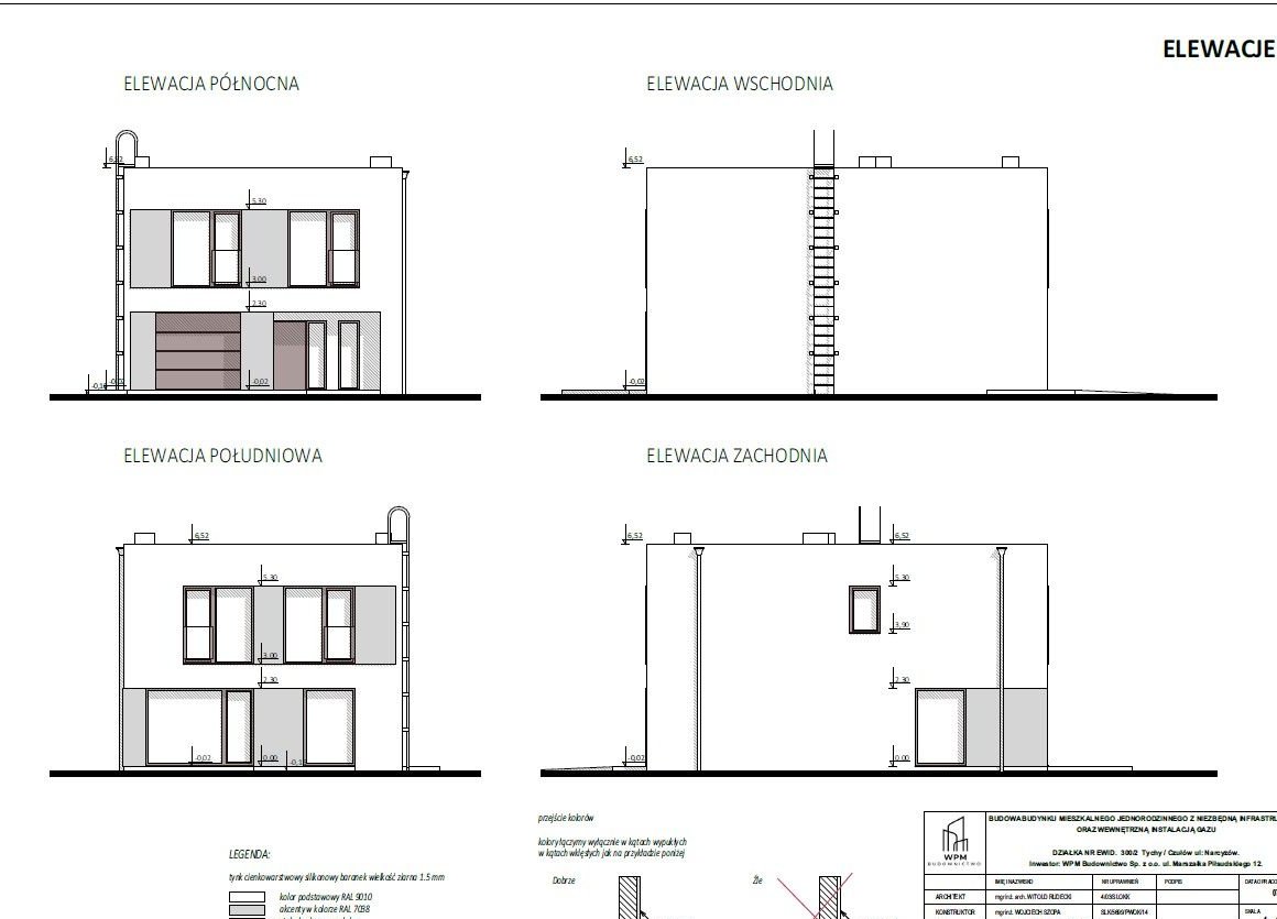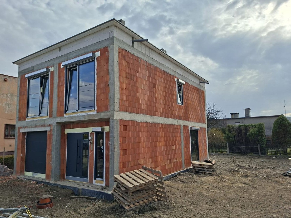 Dom o powierzchni użytkowej 150,1 m² wyróżnia się współczesną, elegancką bryłą oraz zastosowaniem nowoczesnych, trwałych materiałów. Stolarka okienna (system HS) wraz z roletami z napędem elektrycznym, drzwi wejściowe bezprzylgowe oraz brama garażowa segmentowa elektryczna - wszystkie elementy stolarki w nowoczesnym kolorze antracyt. Obiekt posadowiony jest na płycie fundamentowej zaizolowanej styropianem XPS, ściany wykonano z pustaków Leier Plan, a stropy i schody z solidnego żelbetu. Stropodach został przystosowany do montażu paneli fotowoltaicznych, co pozwala znacząco obniżyć koszty eksploatacji.