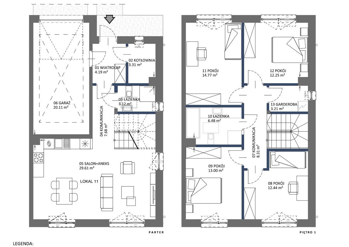 - cztery sypialnie 14,77 m2 , 13 m2, 12.25 m2 oraz 12,44 m2