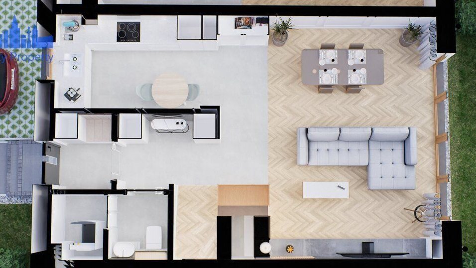 Na parterze, przechodząc przez wiatrołap, znajdziemy salon o powierzchni 27m2 z aneksem kuchennym o powierzchni 8m2. Z salonu wyjście podwójnymi drzwiami tarasowymi na ogródek. Na dolnej kondygnacji znajdziemy również WC o powierzchni ok. 4m2.