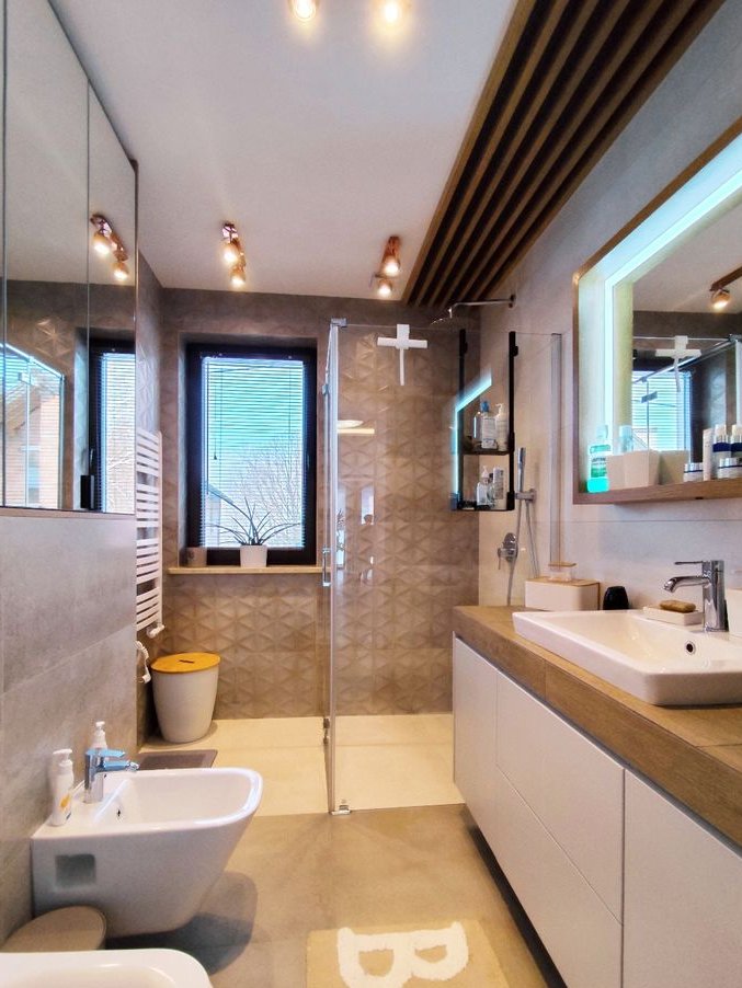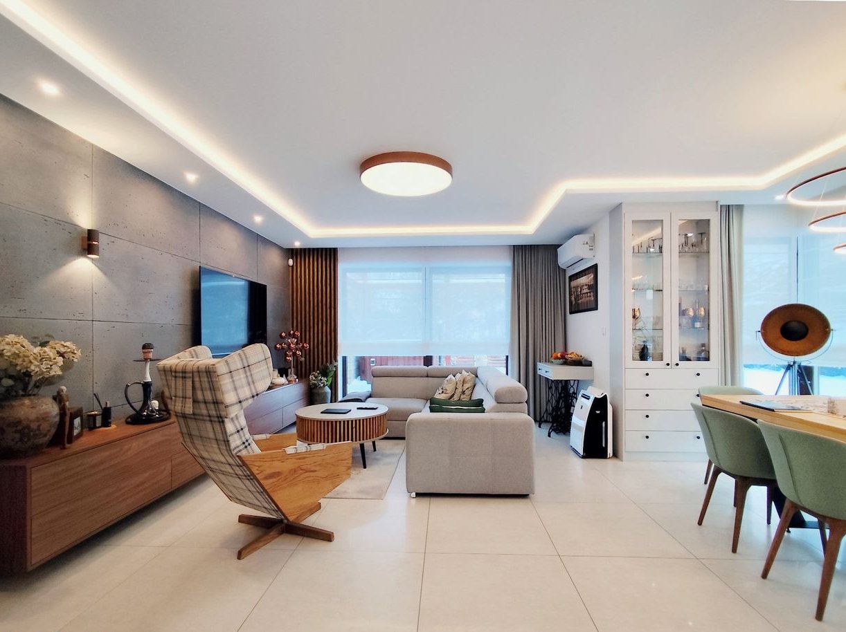 Wszystkie pomieszczenia posiadają ogrzewanie podłogowe regulowane indywidualnie i sterowane aplikacją, a wszystkie pokoje (poza gościnnym) dodatkowo klimatyzację.
