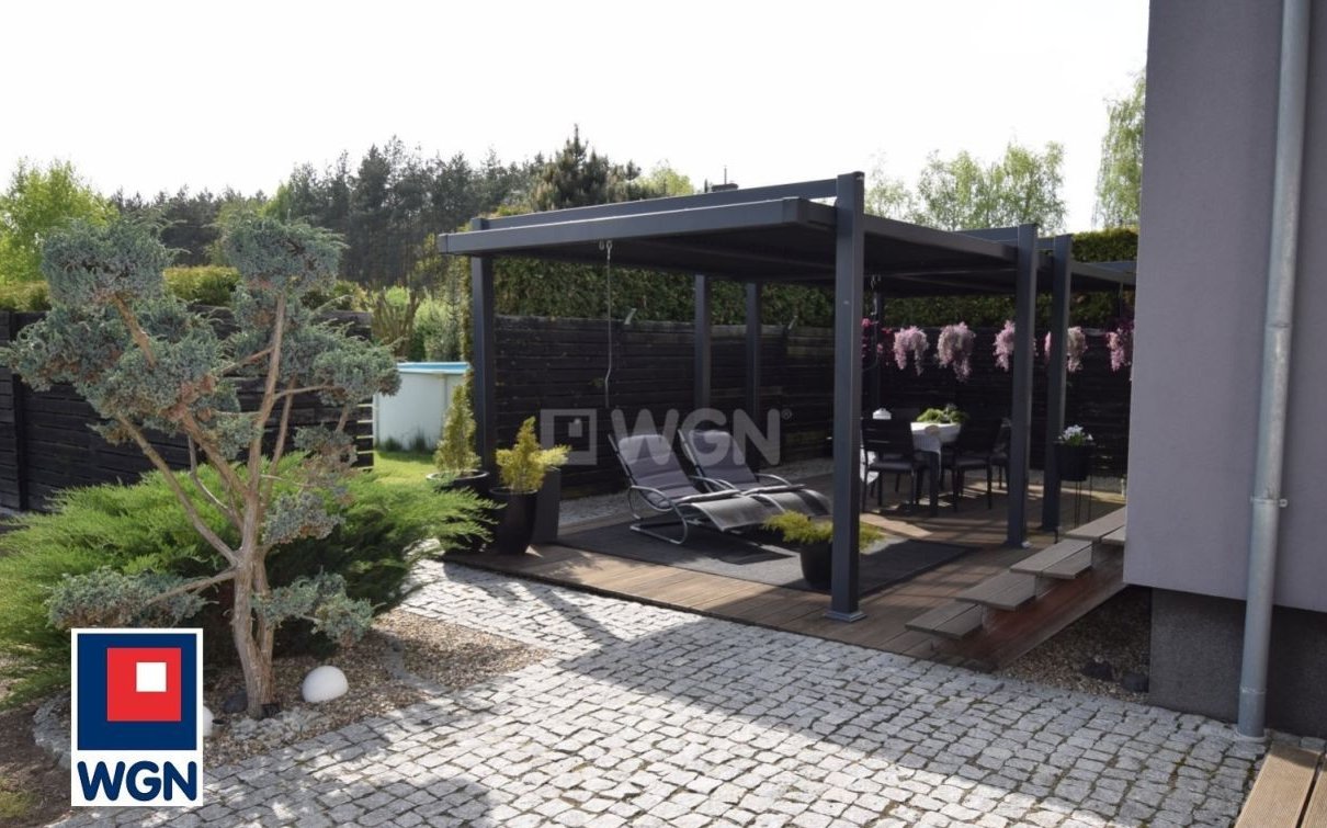 Taras osłonięty jest żywopłotem i posiada metalową wiatę wypoczynkową ze składaną roletą dachową.