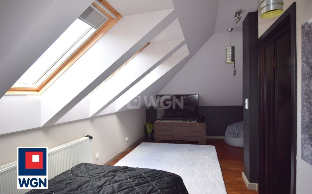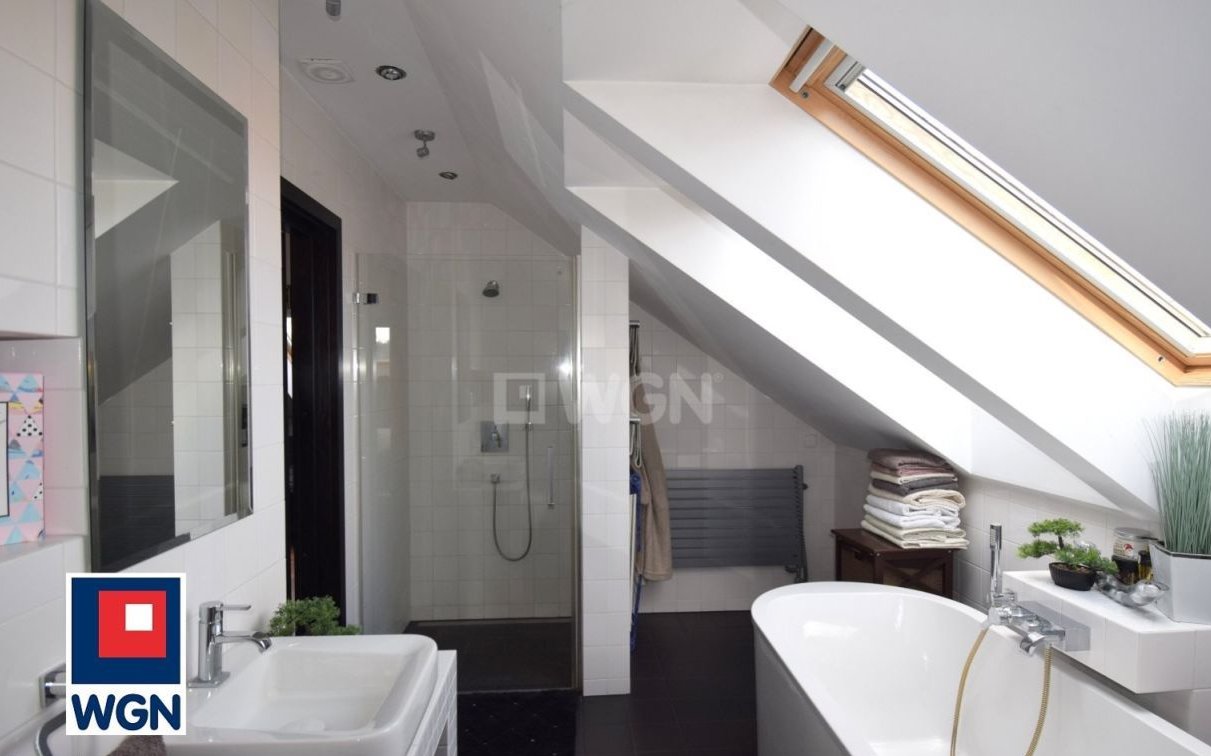Na piętrze dwie sypialnie, każda z garderobą oraz duża łazienka z prysznicem i wanną.