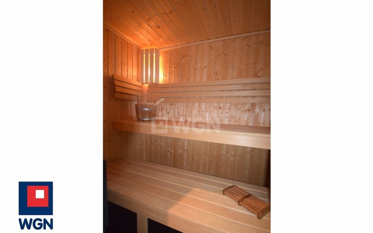 Na parterze znajdują się ponadto dwie sypialnie, siłownia, łazienka z prysznicem i wbudowaną sauną najlepszego fińskiego producenta TYLO. Dodatkowo przedpokój z garderobą, hall, pomieszczenie gospodarcze, z którego przechodzi się do dwustanowiskowego garażu. Nad garażem znajduje się użytkowe poddasze.