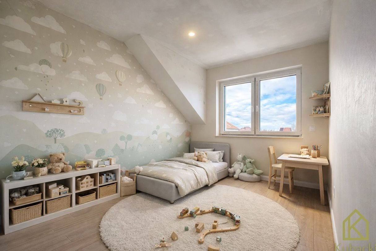 Piętro: 3 sypialnie, w tym jedna z garderobą, duża łazienka, hol oraz wejście na strych.