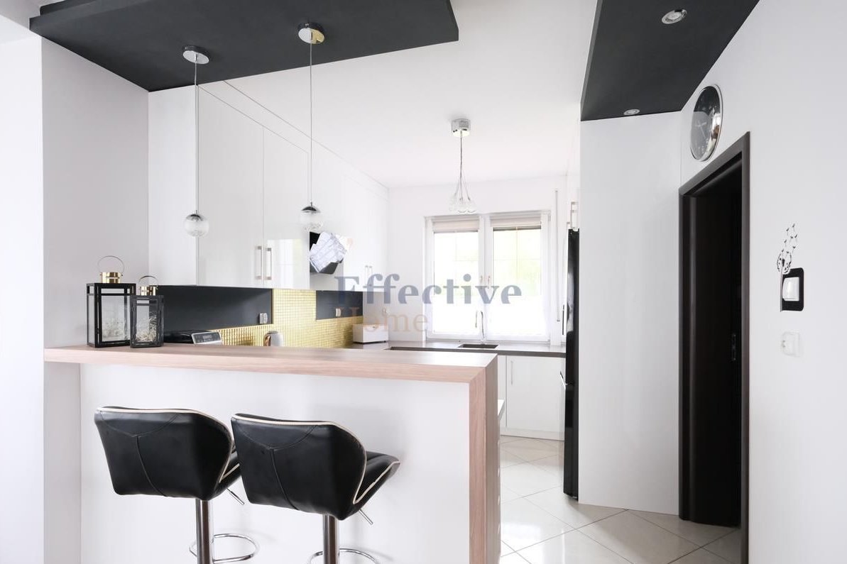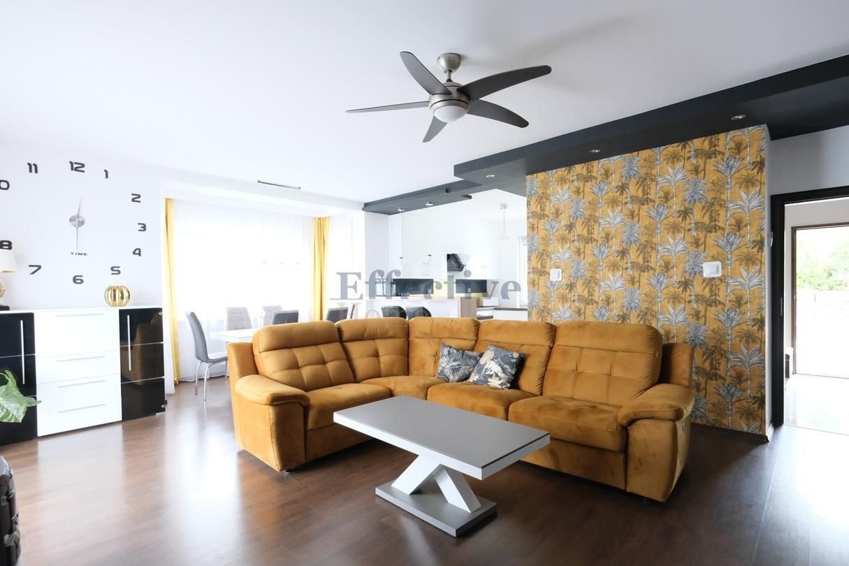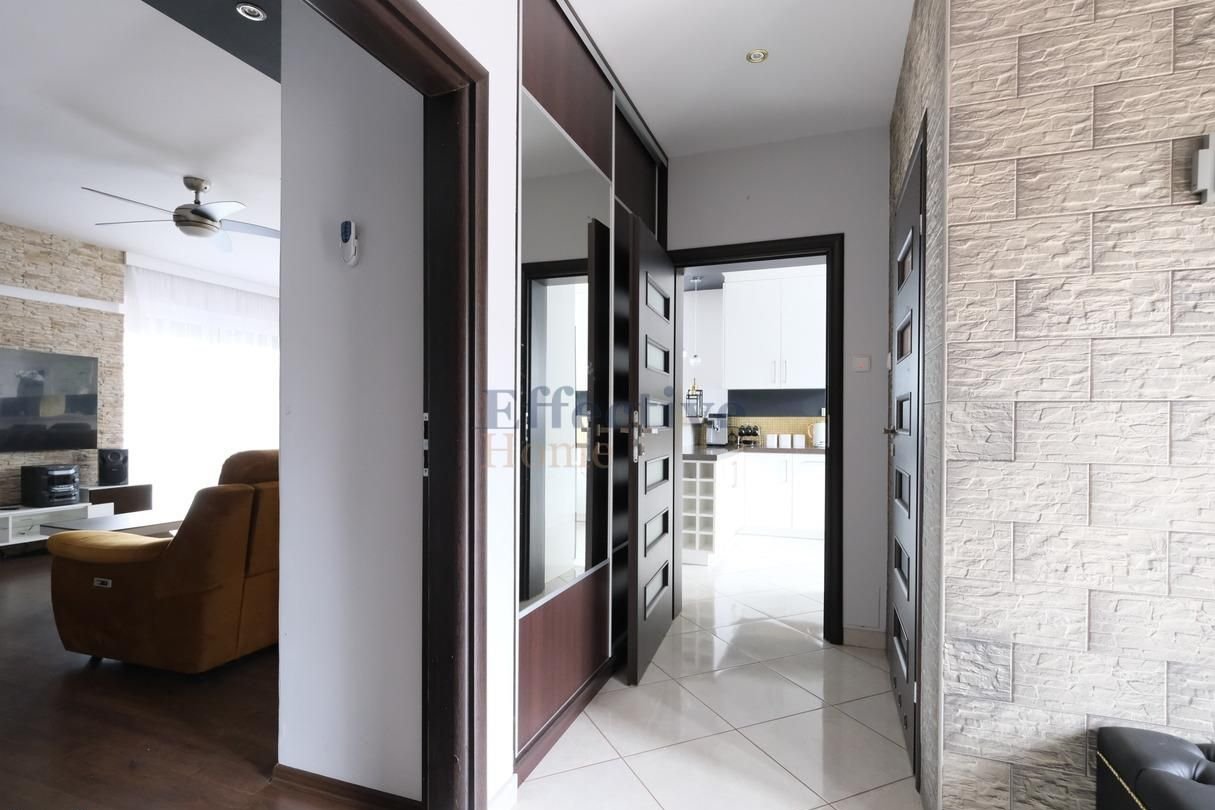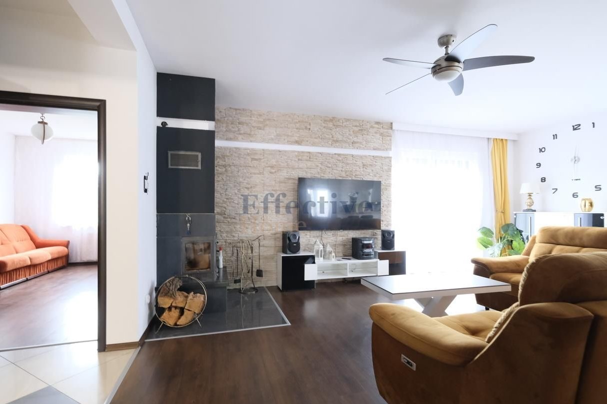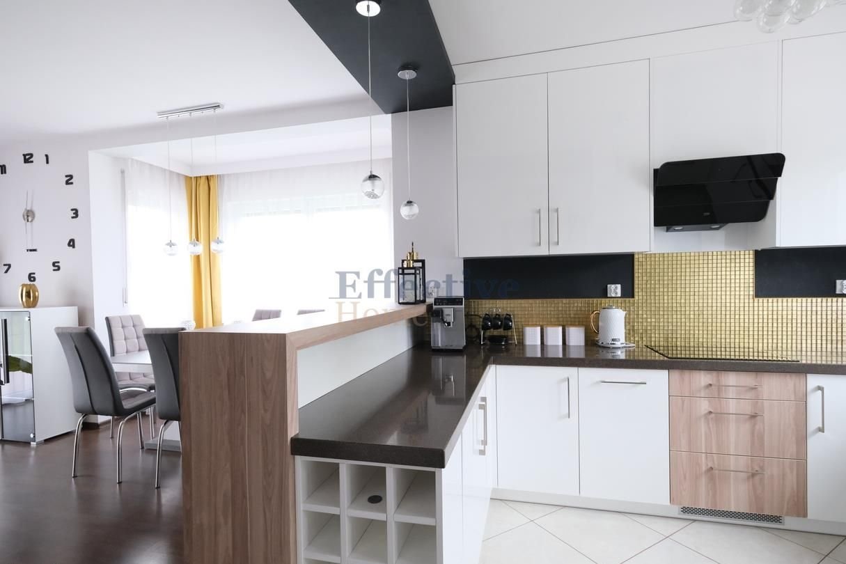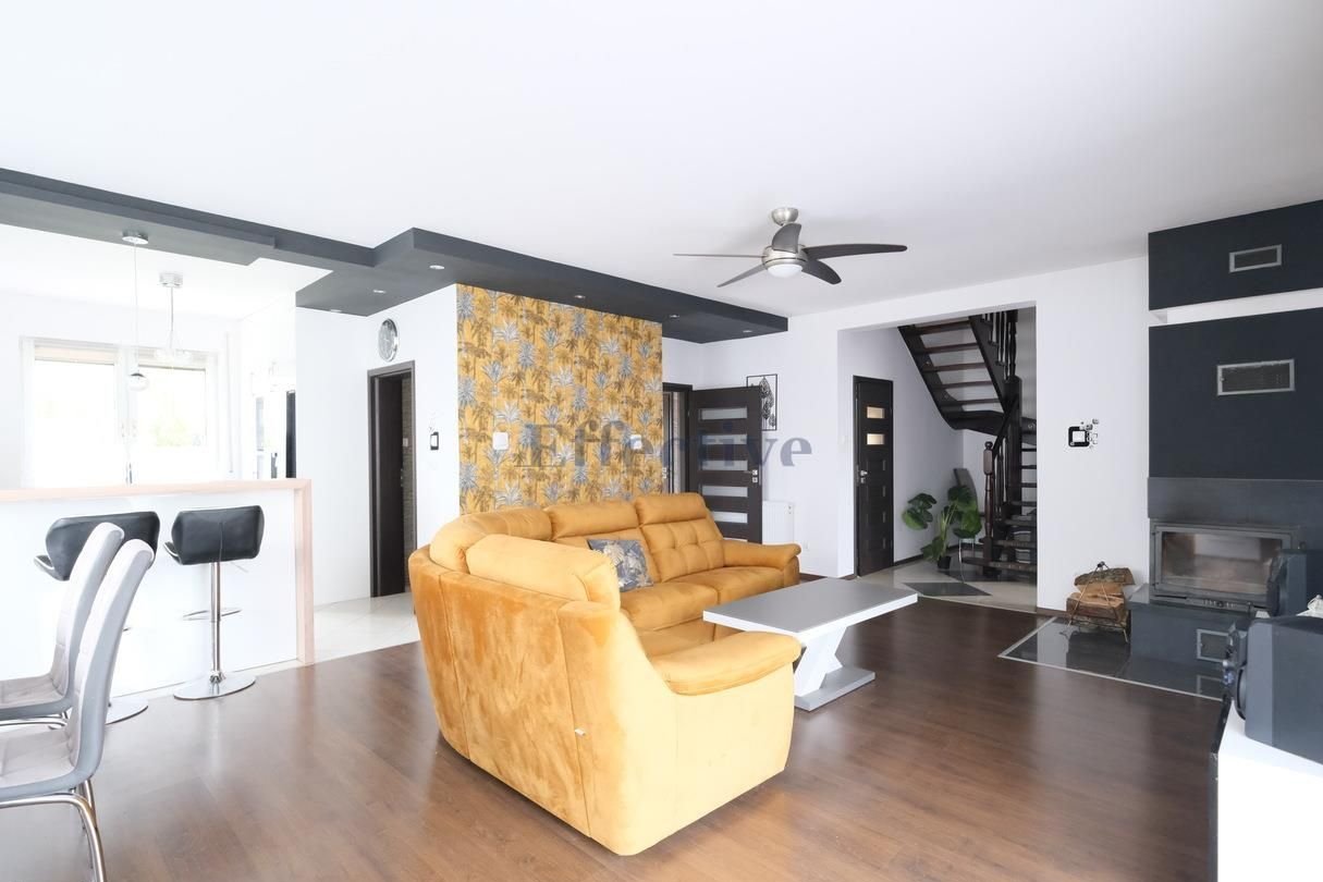 Salon (35 m) w stylu klasycznym, przestronny, jasny z dużymi oknami i wyjściem na taras ogrodowy, połączony z otwarta pięknie doświetloną i w pełni zagospodarowaną kuchnią (11 m). Gabinet/sypialnia (14 m) oraz łazienka (5 m) dla gości. Praktyczny wyposażony w szafy przedpokój (12m). Dodatkowo pralnia (2m), pomieszczenie typu kotłownia (8m) z przejściem do garażu (22m). Prywatna strefa wypoczynkowa na tarasie z meblami ogrodowymi.