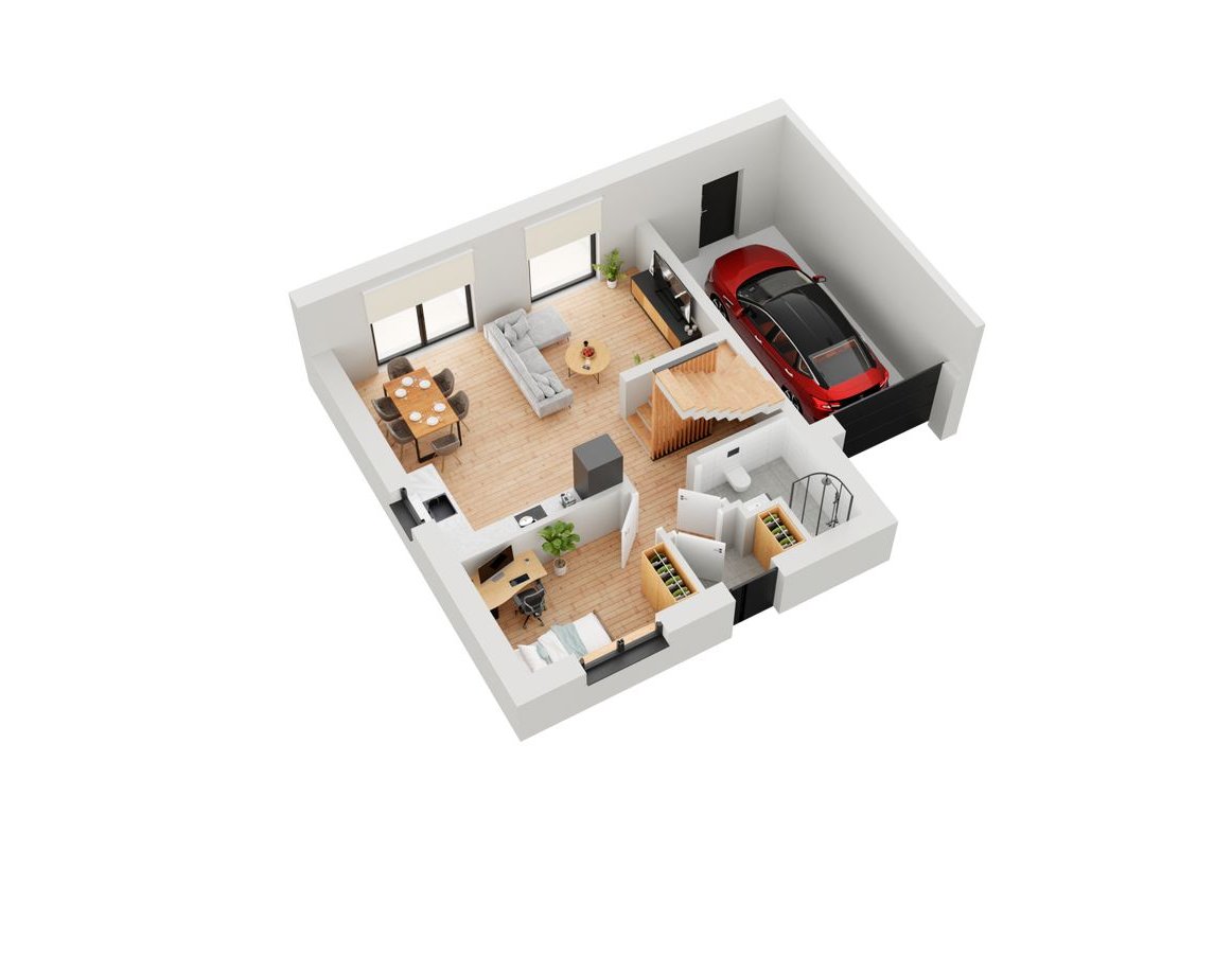 - garaż (19,10 mkw) z wejściem na ogród i bramą wjazdową z napędem