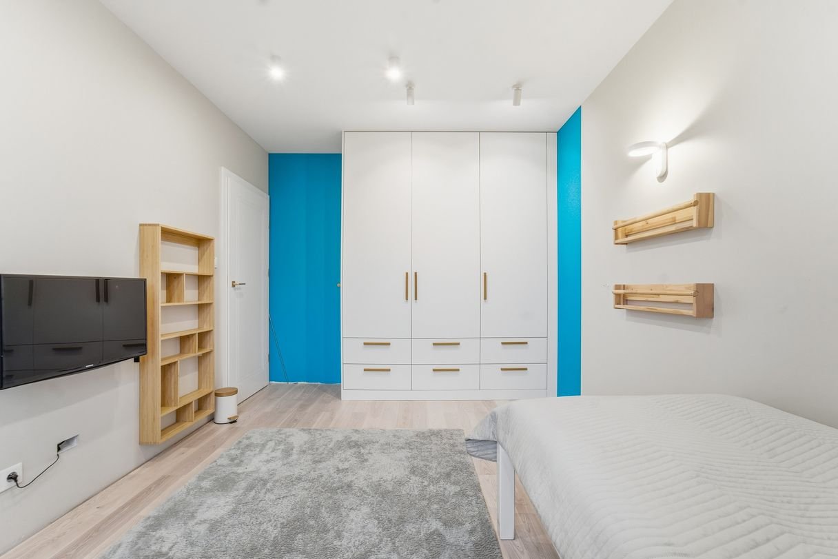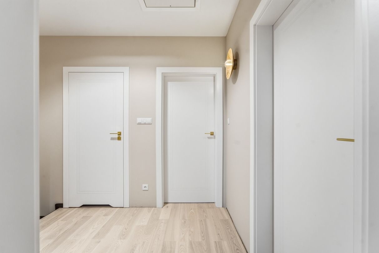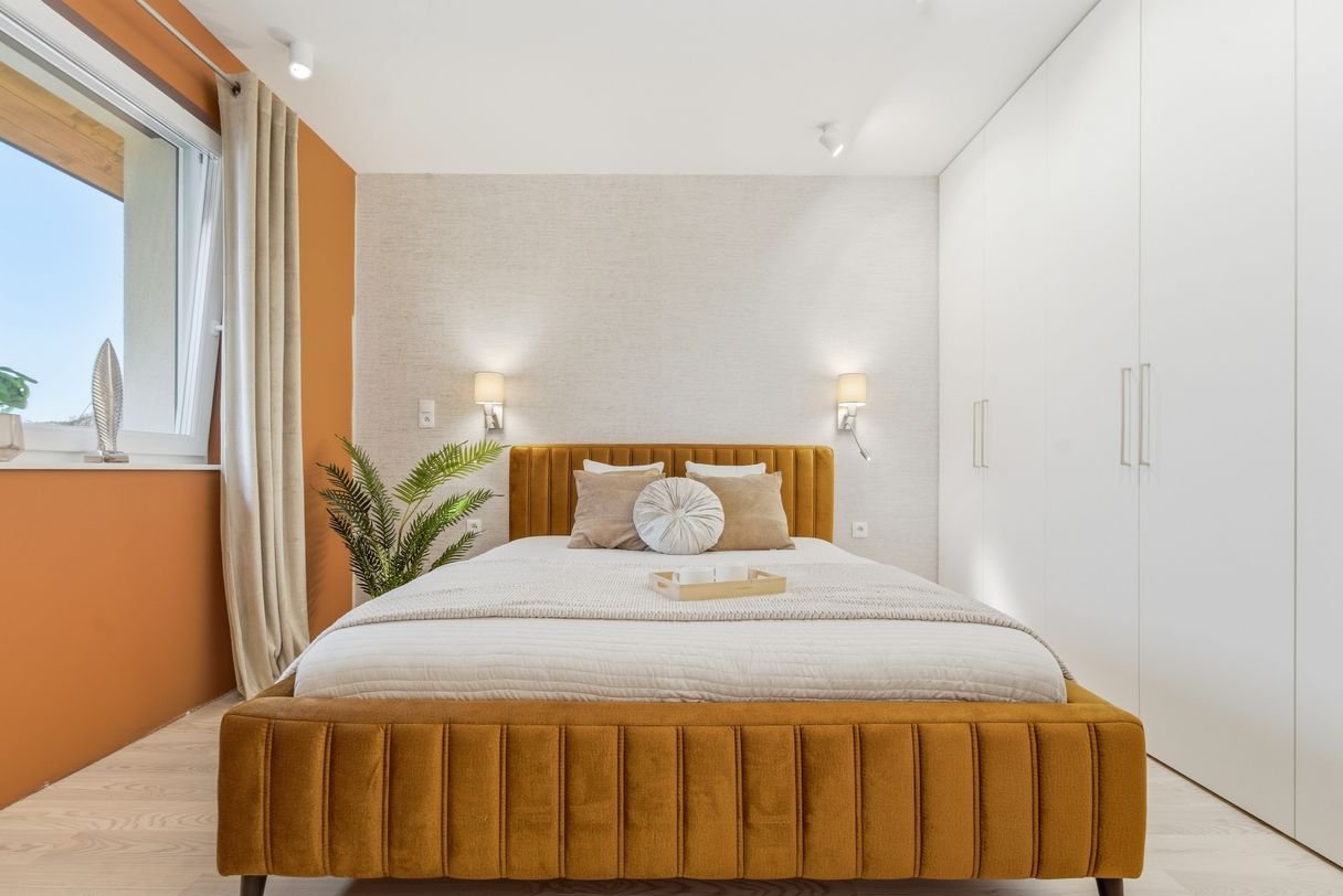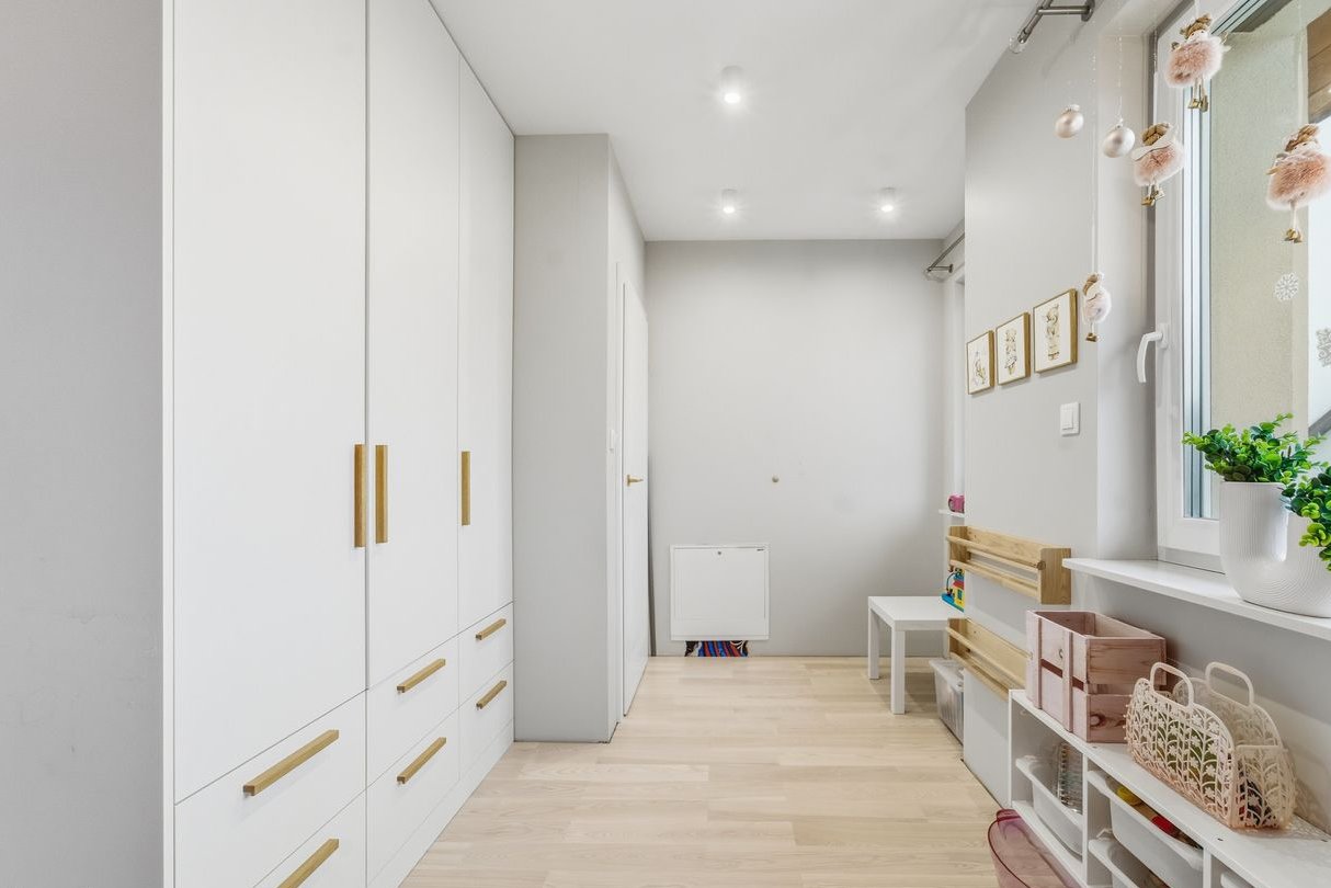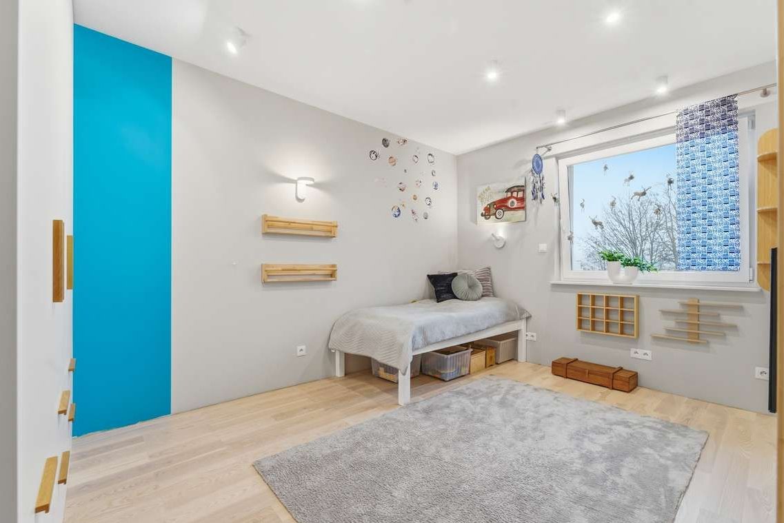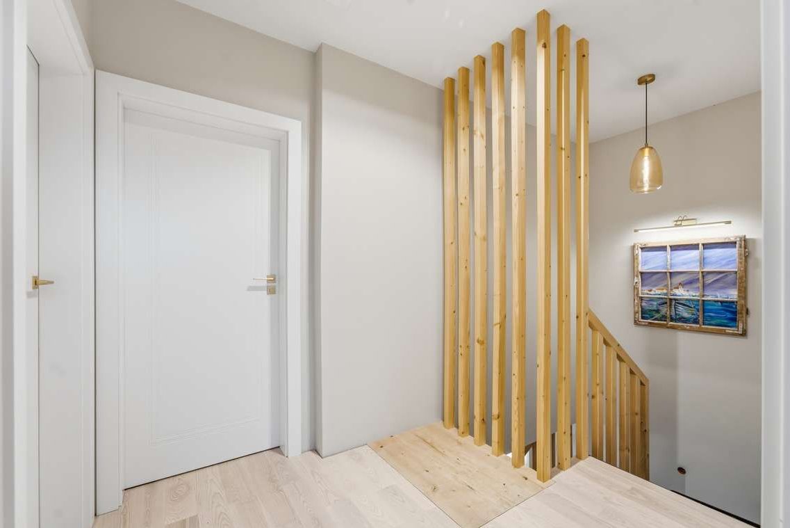 Na piętrze znajdują się trzy oddzielne pokoje, w tym sypialnia z ukrytym, dyskretnym biurem – idealne rozwiązanie dla osób pracujących zdalnie.