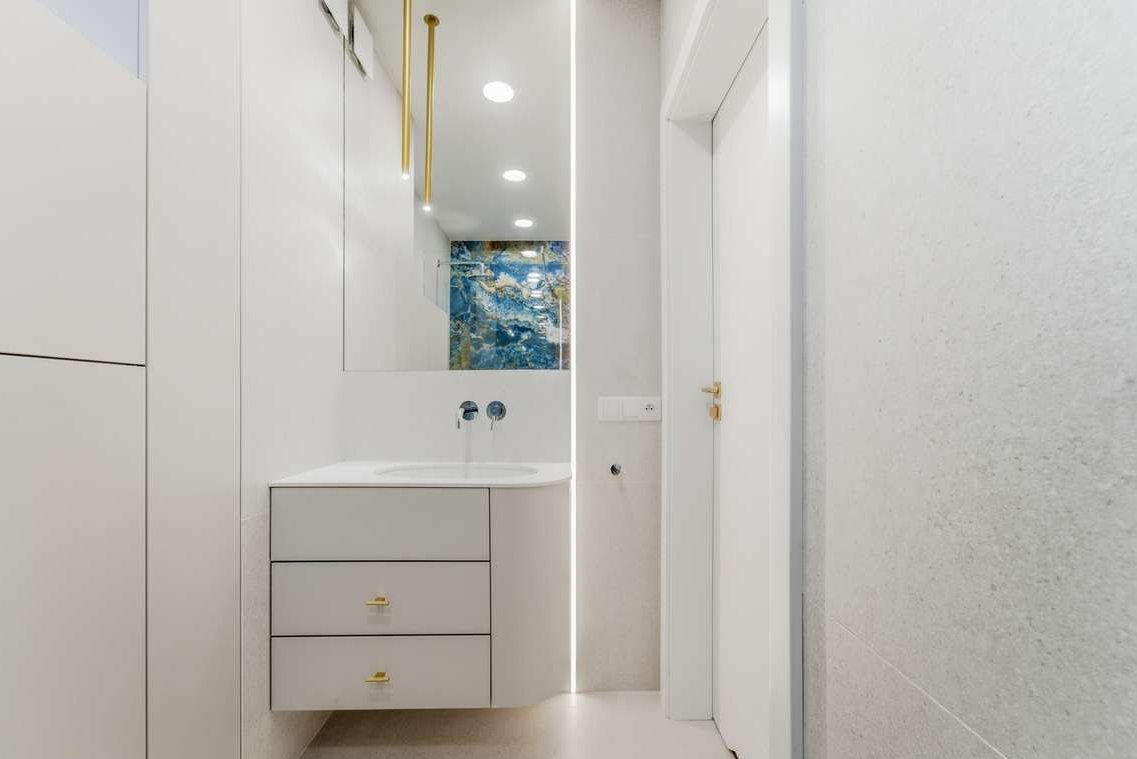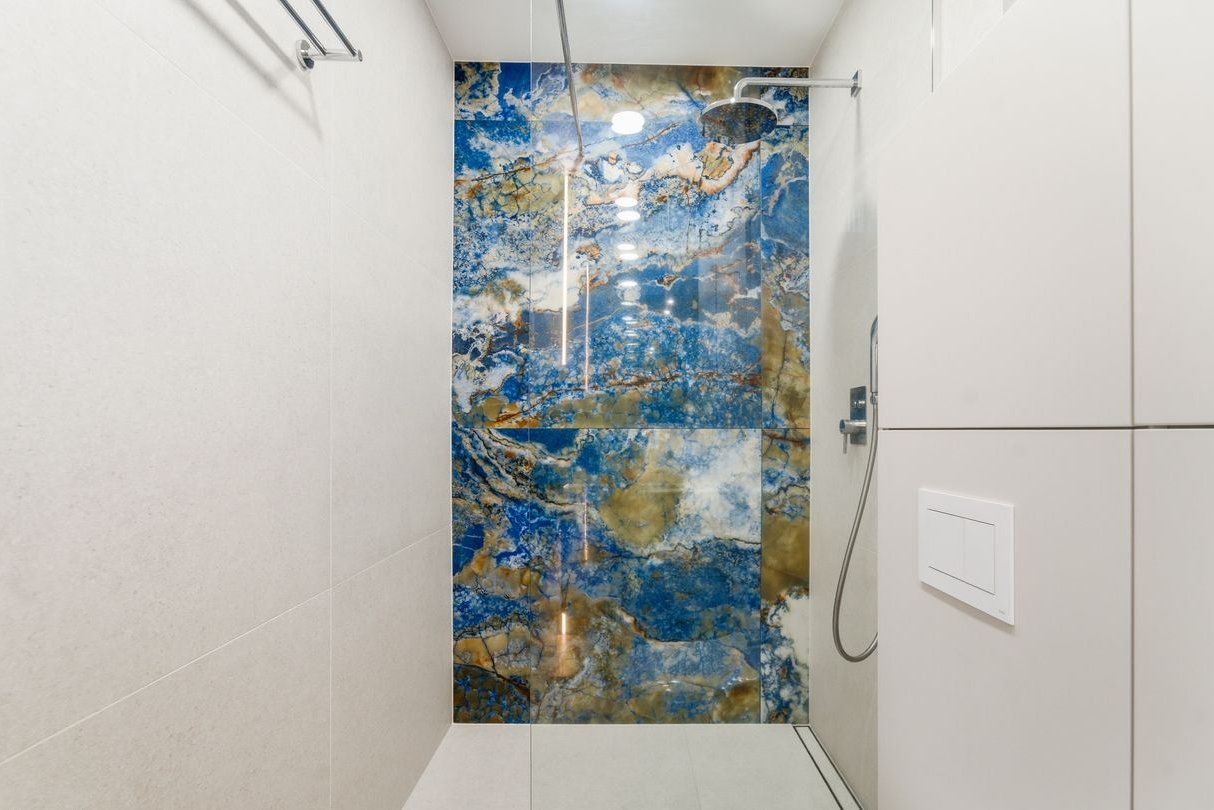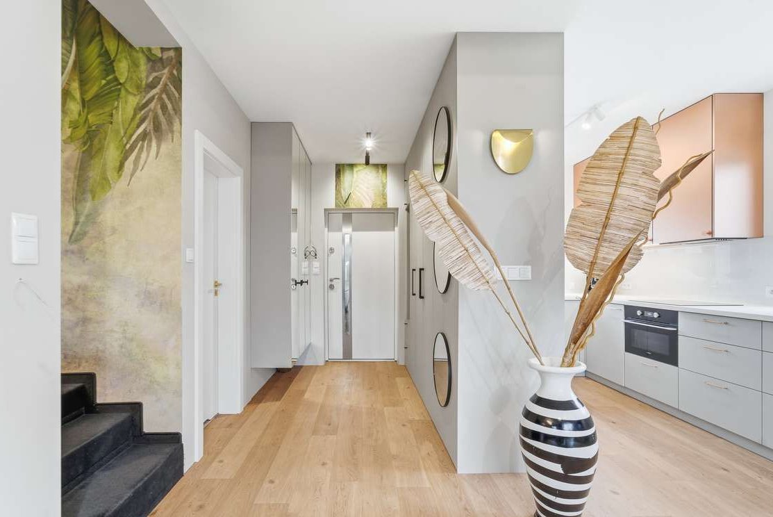 Parter to przestronny salon z jadalnią i nowoczesną kuchnią – miejsce spotkań, rozmów, wspólnych poranków i wieczorów. Kuchnia wykonana pod zabudowę, w pełni wyposażona w sprzęt AGD (lodówka z zamrażarką, zmywarka, piekarnik, płyta indukcyjna, okap) zachwyca designem i funkcjonalnością. Miedziane fronty z akrylu, włoskie płyty laminowane z imitacją skóry i systemy BLUM oraz HETTICH to klasa premium widoczna na każdym kroku. W salonie uwagę przyciąga naturalny kamień – trawertyn, materiał ponadczasowy, elegancki i zawsze modny.