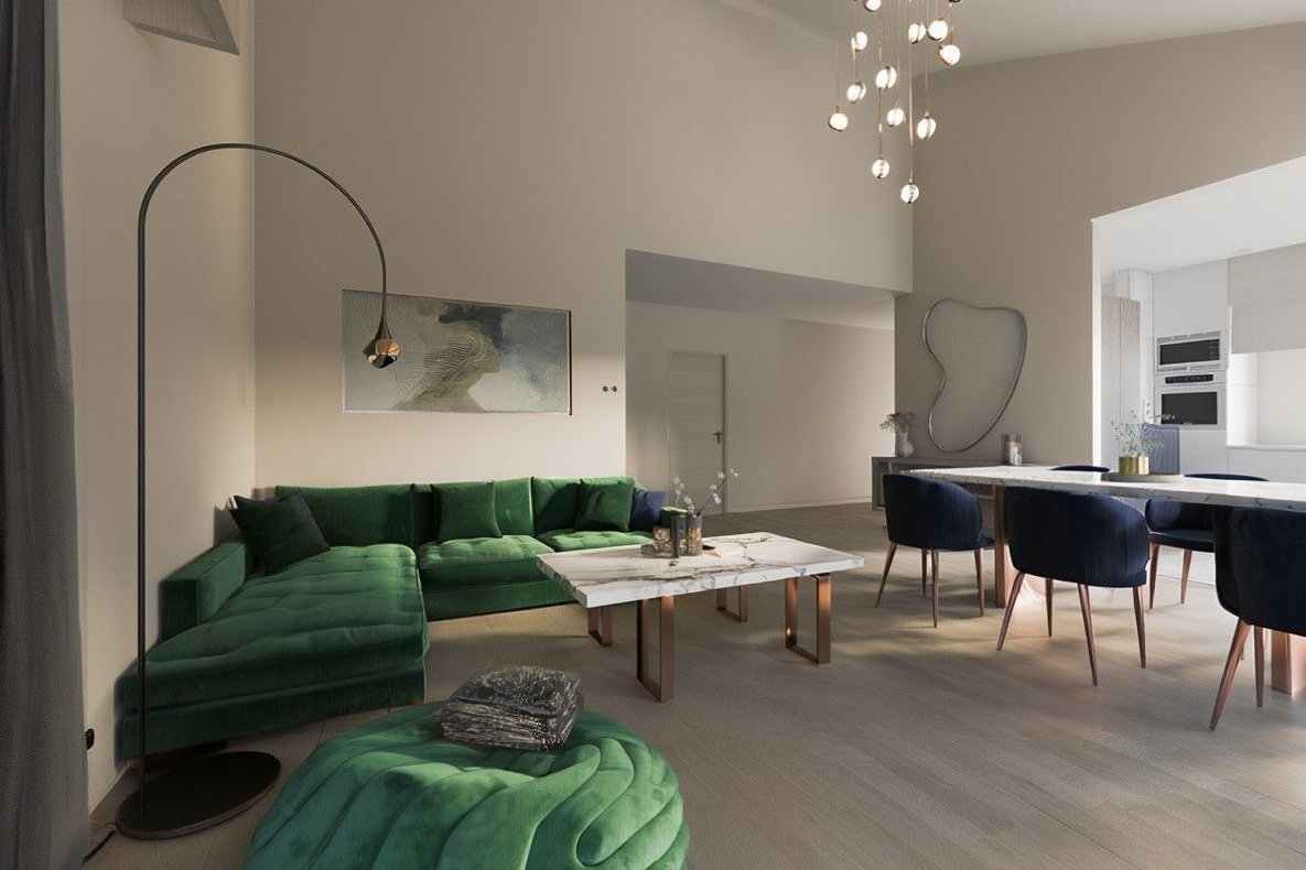 • przestronny salon z wyjściem na taras oraz wysokim sufitem.