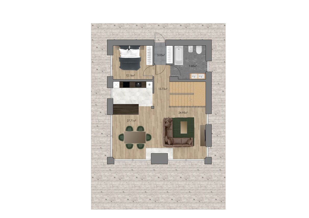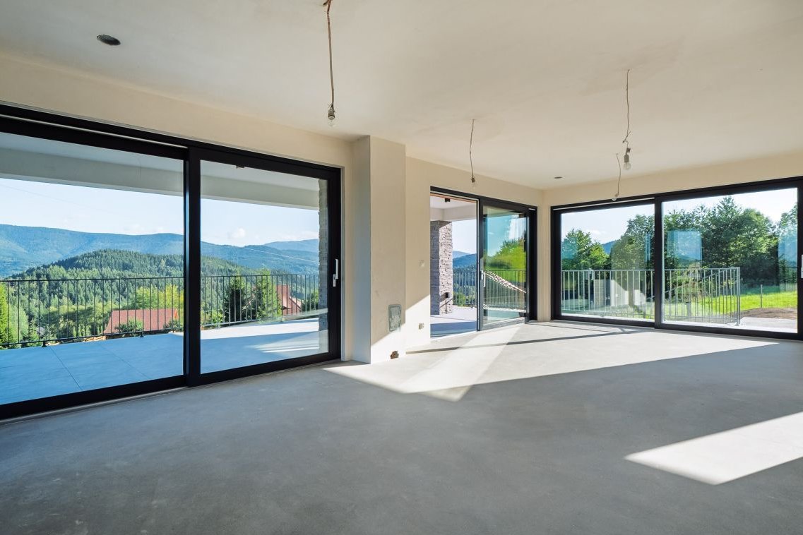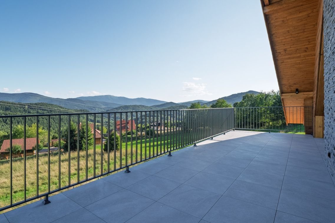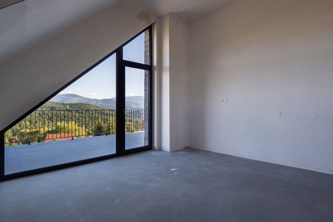 – salon (24,95m²) połączony z kuchnią i jadalnią (27,71m²) z wyjściem na taras z widokiem na Babią Górę i Beskidy,