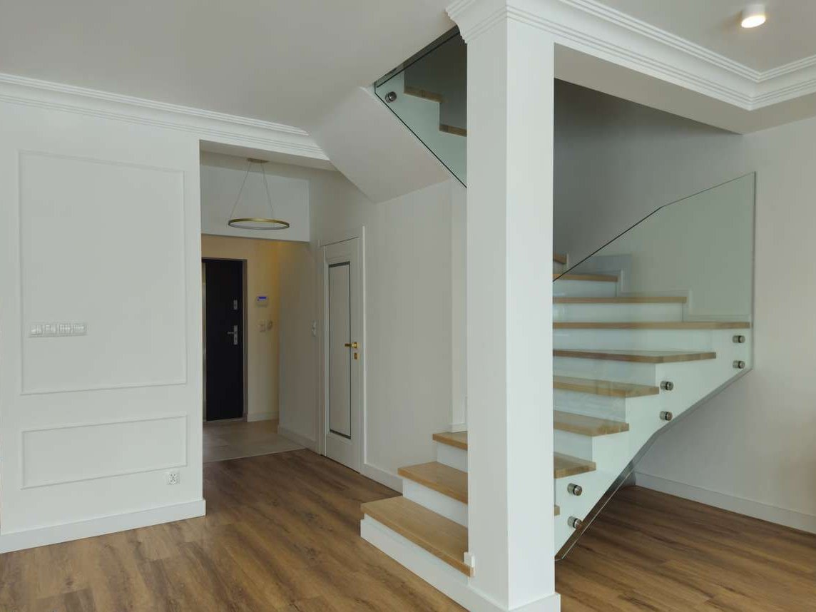 Nowoczesne schody ze szklanymi balustradami i drewnianymi stopniami stanowią efektowny element architektoniczny i podkreślają prestiżowy charakter wnętrza.