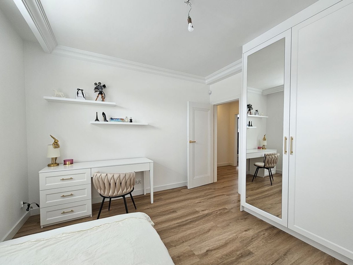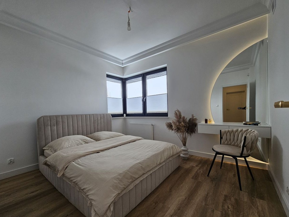 Główna sypialnia (11,10 m²) to jasna i bardzo komfortowa przestrzeń, idealna do wypoczynku. Bez problemu mieści duże łóżko małżeńskie, szafki nocne oraz pojemną zabudowę meblową. Duże okna zapewniają naturalne światło oraz widok na zieleń, co sprzyja relaksowi i regeneracji.