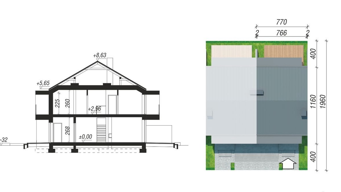 Wszystkie domy w sprzedaży posiadają 2 pietra oraz 125,14 m2 powierzchni użytkowej wraz z garażem w bryle budynku oraz dodatkowe pomieszczenie strychowe o powierzchni 20m2. Całoszklane balustrady na balkonach, drewniana okładzina elewacyjna oraz bezokapowy dach pokryty blachą na rąbek podkreślają nowoczesny charakter budynku. Wszystko zgodnie z projektem ARCHON+ Projekty Domów.