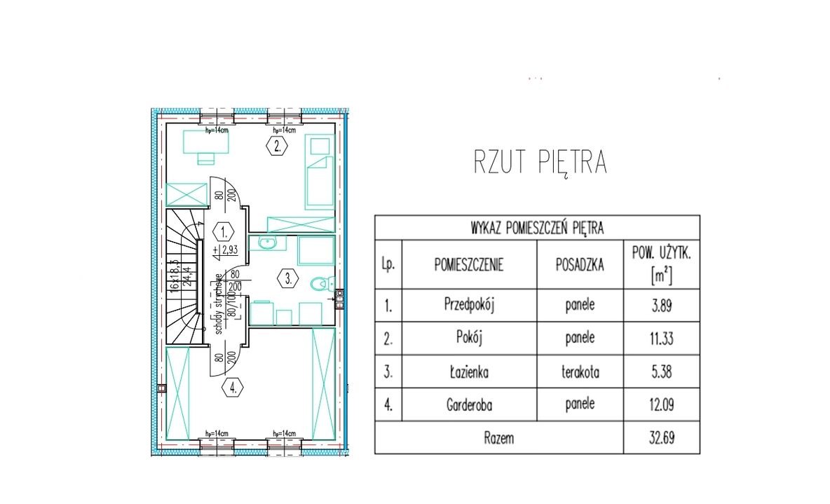 Na piętro prowadzą solidne betonowe schody, które przyszli właściciele mogą zaaranżować według własnych preferencji. Na tej kondygnacji znajdują się: