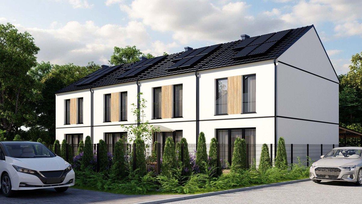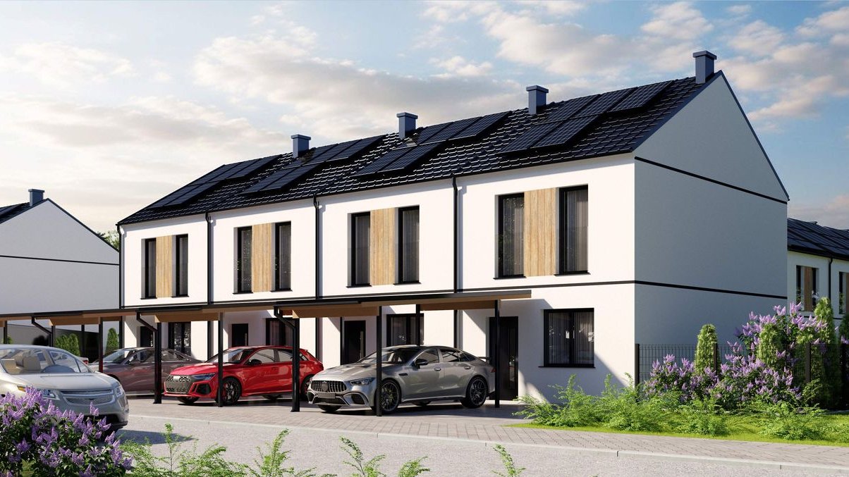 Nowy dom szeregowy z garażem i wiatą, fotowoltaiką, skrajna działka.