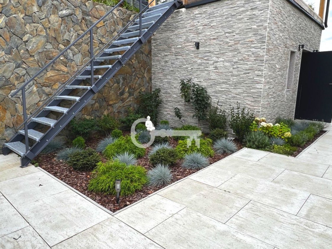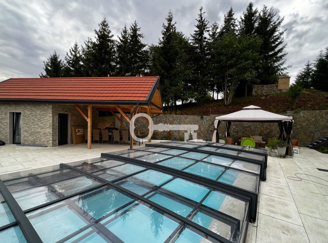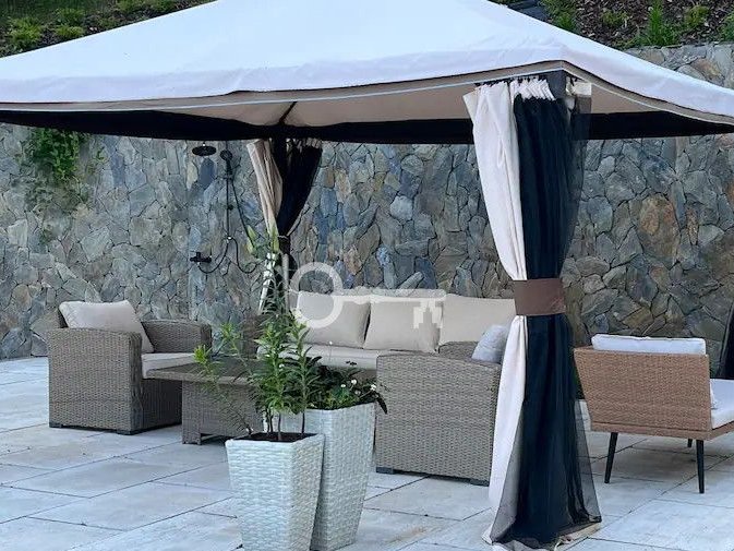 The garden is suitable for active outdoor activities. On sunny days, shelter will be provided by a garden tent with a set of lounge furniture in techno rattan. A large paved terrace and a long table with chairs for 10 people under a covered canopy will ideally serve as a space where friends and family can spend time together at the table with a barbecue. The biggest asset of the garden is the swimming pool and outdoor shower.