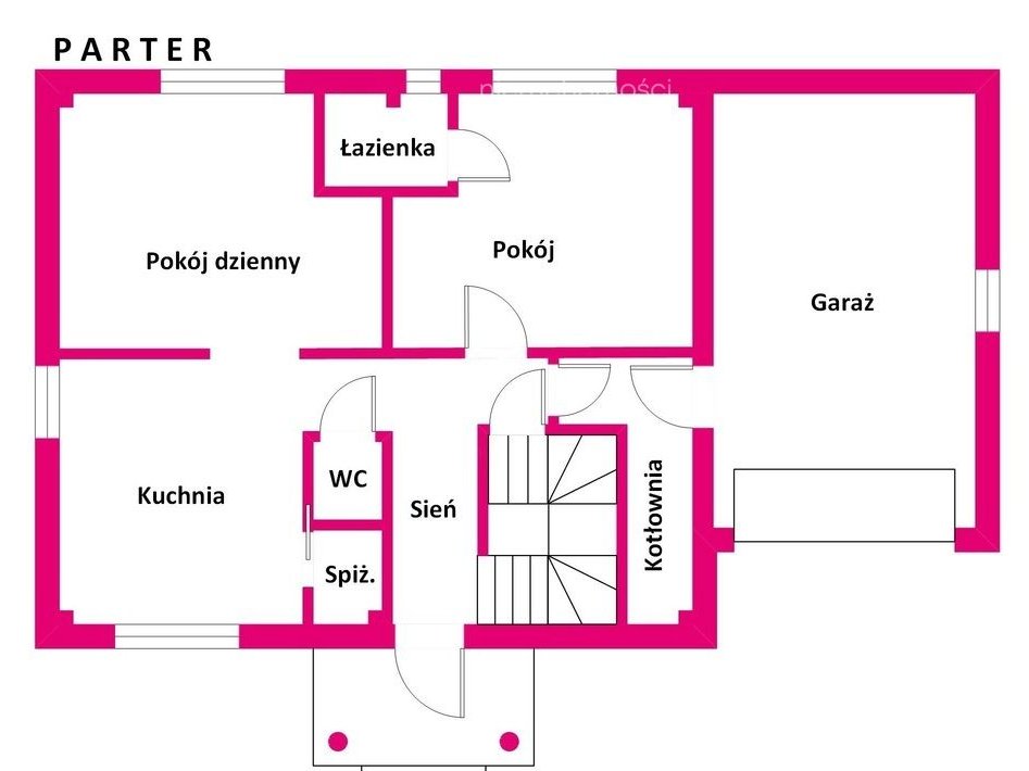 Parter (74 m2): salon, kuchnia, spiżarka, WC, łazienka, sypialnia, kotłownia, garaż