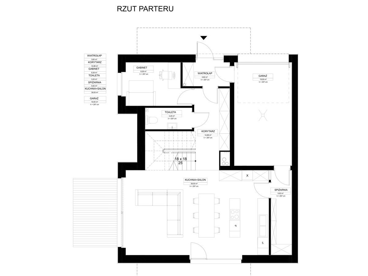 Parter to przestronna strefa dzienna z salonem połączonym z kuchnią i jadalnią, bezpośrednim wyjściem na taras i ogród, a także garażem i pomieszczeniami pomocniczymi.