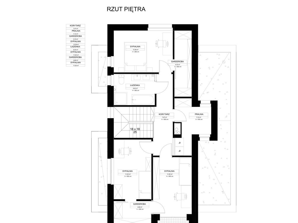 Piętro stanowi komfortową strefę prywatną z sypialniami, łazienką oraz dodatkowymi pomieszczeniami do aranżacji według potrzeb.