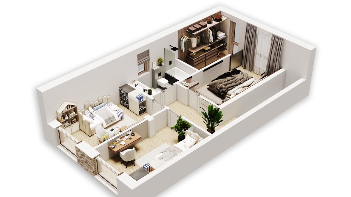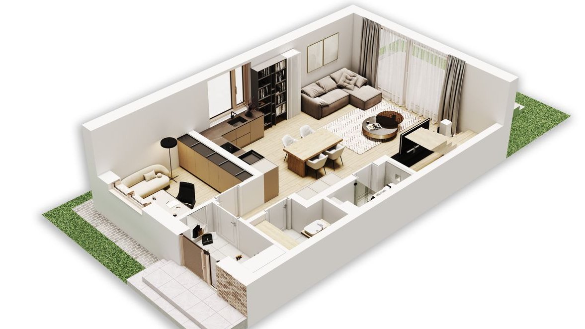 Każdy dom o projektowanej powierzchni użytkowej 106,32m2 został zaprojektowany tak, aby zapewnić maksymalną przestrzeń i wygodę. Na parterze znajduje się przestronny salon z dużym aneksem kuchenny i wyjściem na taras. Dodatkowym atutem jest gabinet, który może służyć jako pokój gościnny, miejsce świetnie nadające się do pracy zdalnej lub jako biblioteka. Zaprojektowaliśmy również na tej powierzchni łazienkę i pomieszczenie gospodarcze, w którym zainstalowany będzie piec gazowy. Na piętrze (brak skosów) znajdują się główna łazienka oraz 3 sypialnie, w tym jedna z garderobą zapewniając intymność i komfort mieszkańcom. W każdym domu znajduje się również strych – świetne miejsce do przechowywania rzeczy.
