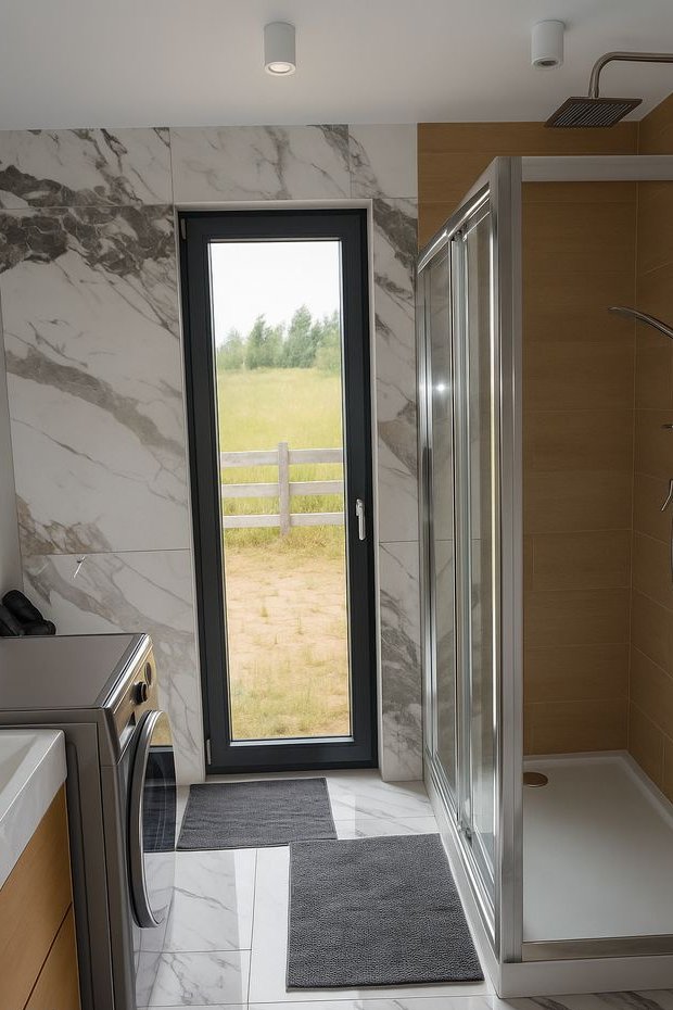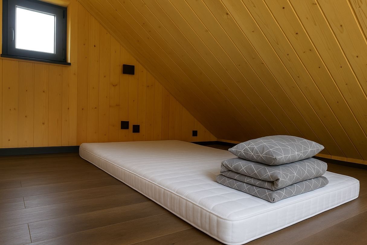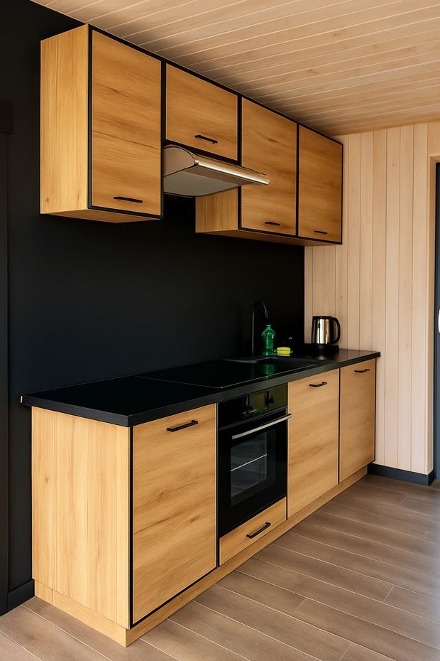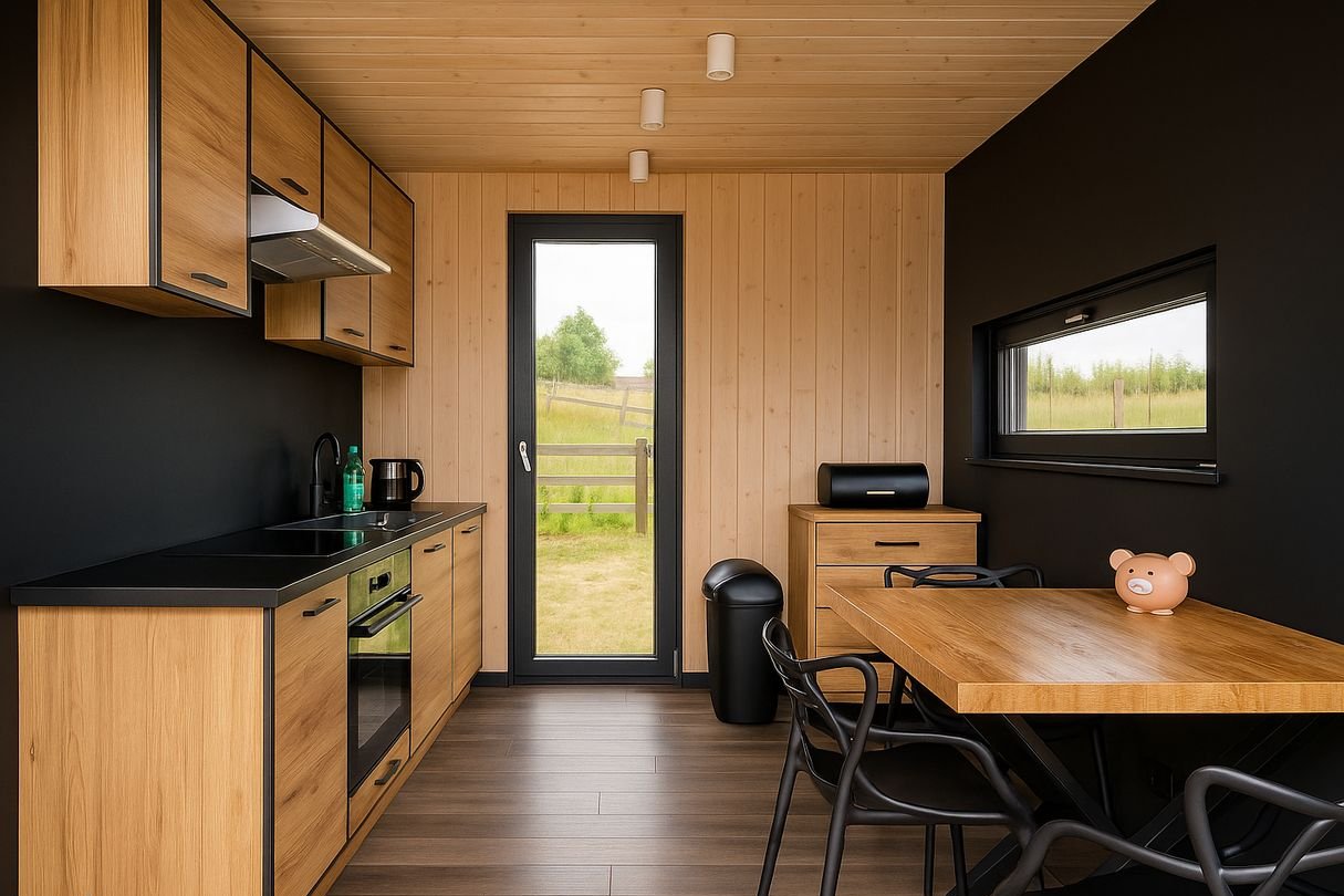 Dom jest gotowy na nowych mieszkańców, w pełni wyposażona kuchnia, wykończona łazienka, klimatyzacja, brakuje jedynie schodów na antresolę. Wykonane z naturalnego drewna ściany i podłoga wnoszą ciepło do minimalistycznego wnętrza domu, łagodząc surowość bryły budynku I minimalistycznej stylistyki.