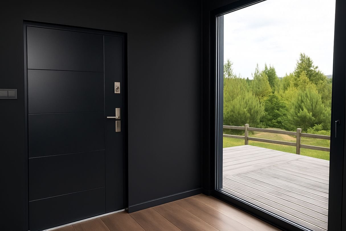 Dom charakteryzują nowoczesna i minimalistyczna bryła w modnych szarościach, staranne wykonanie, i duże przeszklenia.