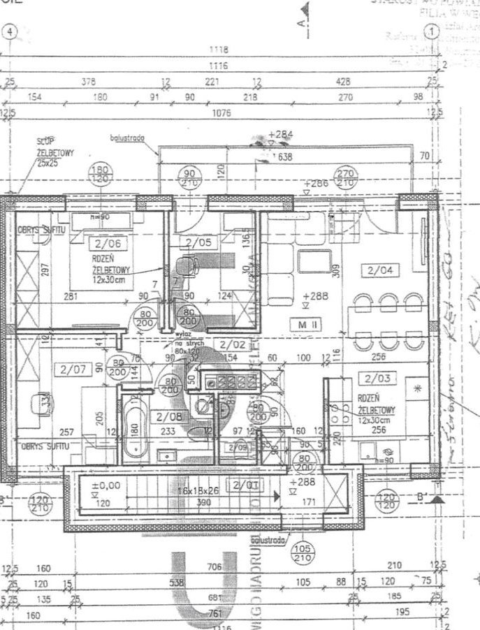 4 pokoje: salon z aneksem kuchennym, sypialnie, garderoba, 2 łazienki: łazienka z wanną/prysznicem + osobne WC z pralnią, garderoba, schowek