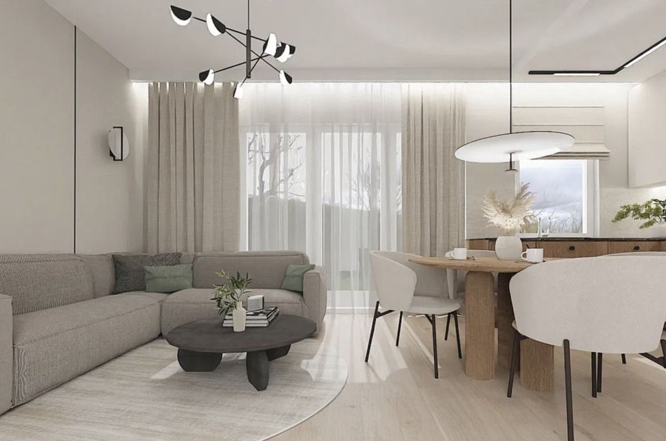 Funkcjonalny układ pomieszczeń, duże przeszklenia zapewniające naturalne oświetlenie.