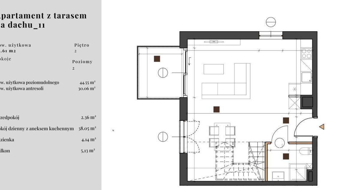 * Pokój dzienny z aneksem kuchennym - 38,05 m²,