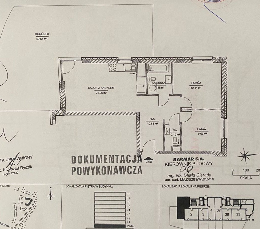 Mieszkanie o powierzchni ponad 60 m², położone na parterze.
