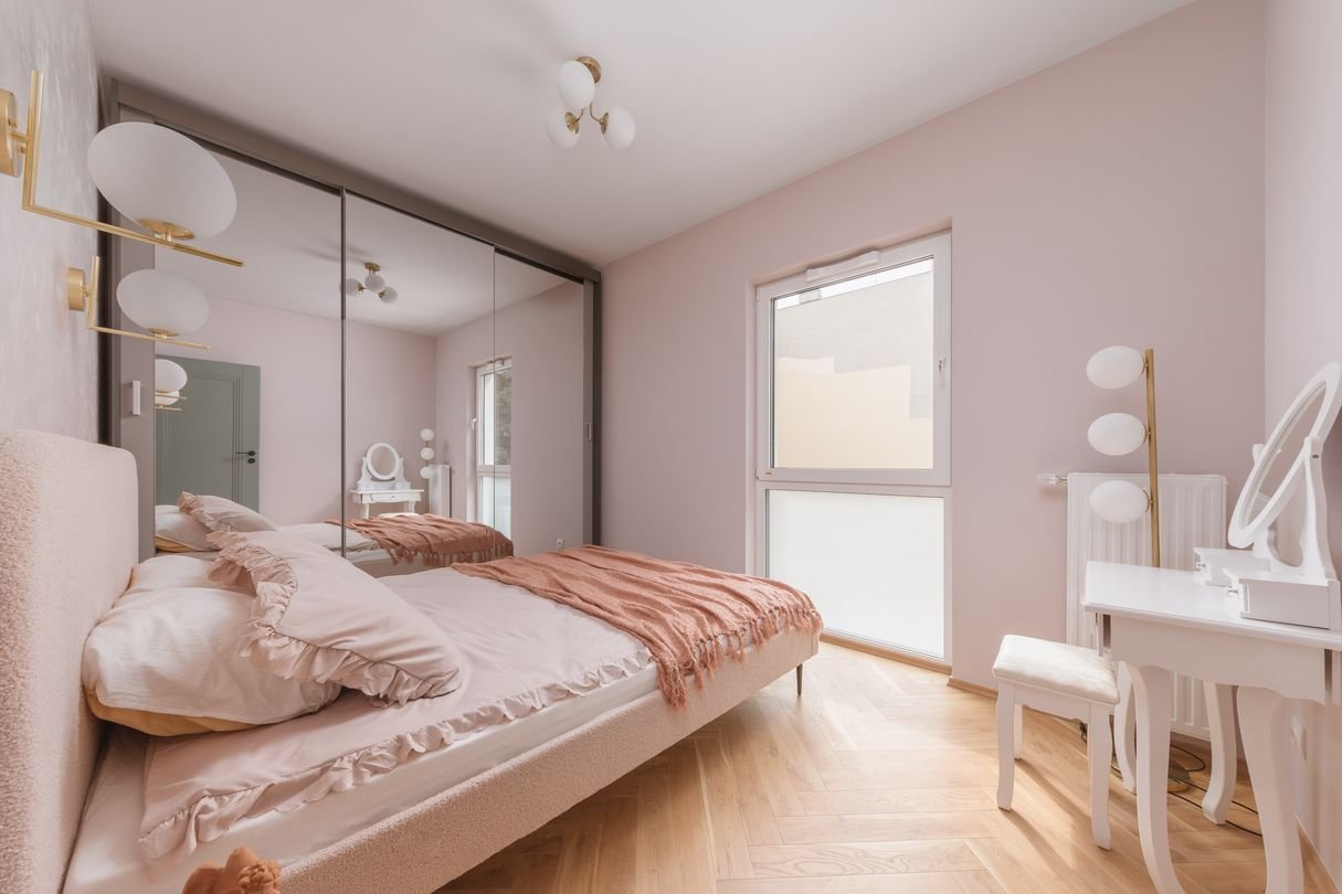Sypialnia: Przestronna sypialnia z dużym łóżkiem oraz ogromną szafą, która zapewnia mnóstwo miejsca na przechowywanie.