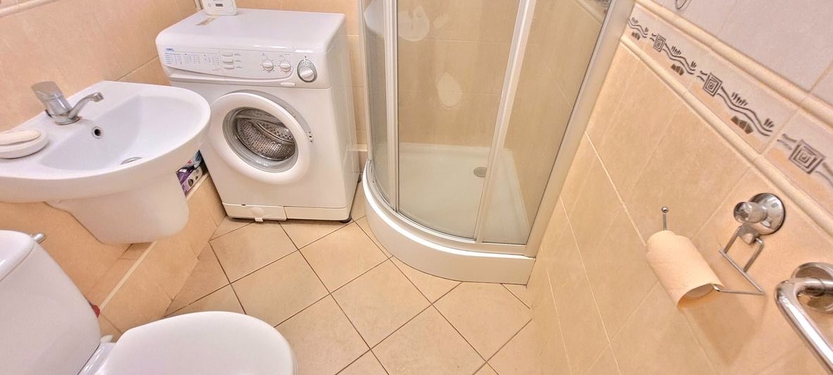 Łazienka –ustawna, wykończona starannie, wyposażona w kabinę prysznicową, umywalkę, lustro, wc, pralkę. Jasne pastelowe płytki sprawiają, że wnętrze jest eleganckie i funkcjonalne, ponadczasowe/3,20m2/