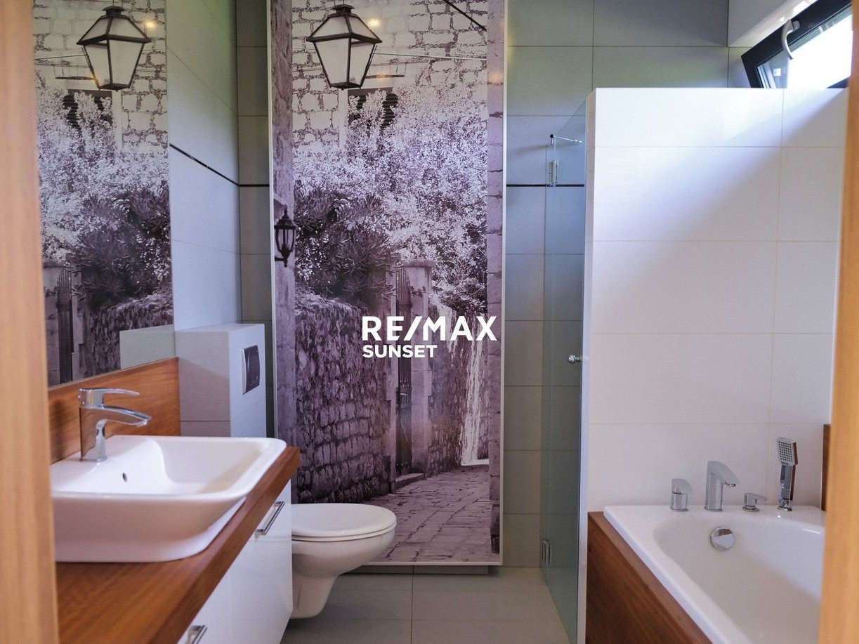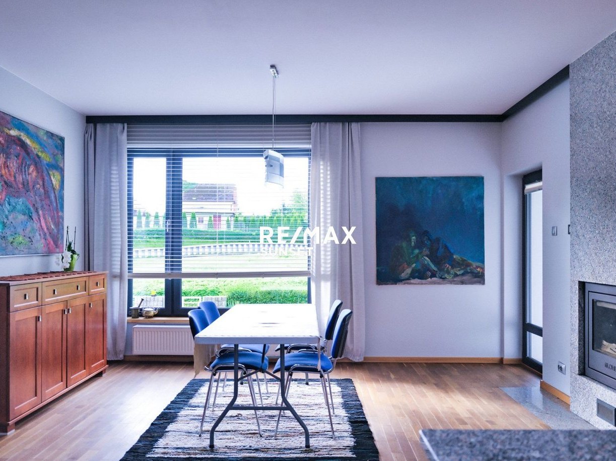Już od progu wita Cię elegancki przedsionek z pojemną szafą, prowadzący do otwartej przestrzeni pełnej światła. Centralnym punktem jest jadalnia z kominkiem wykończonym naturalnym kamieniem – prawdziwe serce domu. Obok znajduje się nowoczesna kuchnia z kamiennym blatem i zabudową AGD, a dalej przestronny salon z ekspozycją południową i wyjściem na taras.