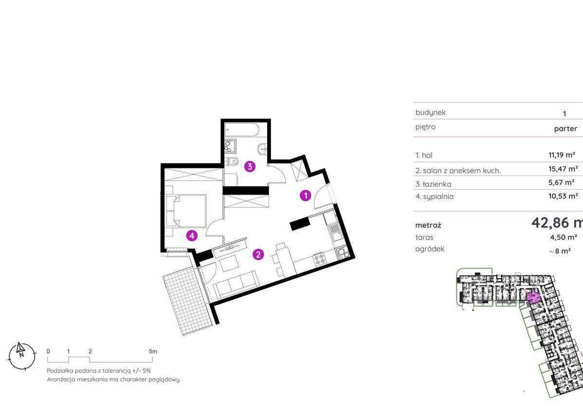 Mieszkanie dwupokojowe o pow. 43m2 znajdujące się na parterze nowego budynku.