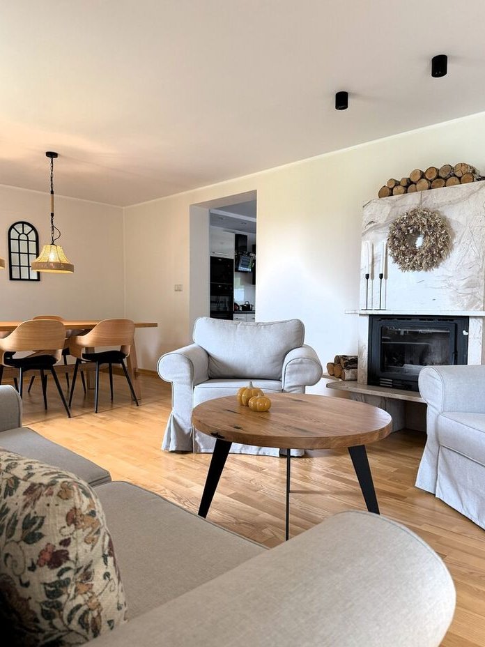 przestronny salon z kominkiem i wyjściem do ogrodu;