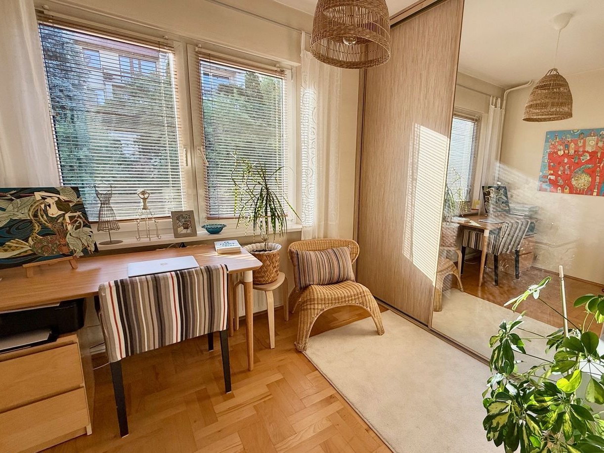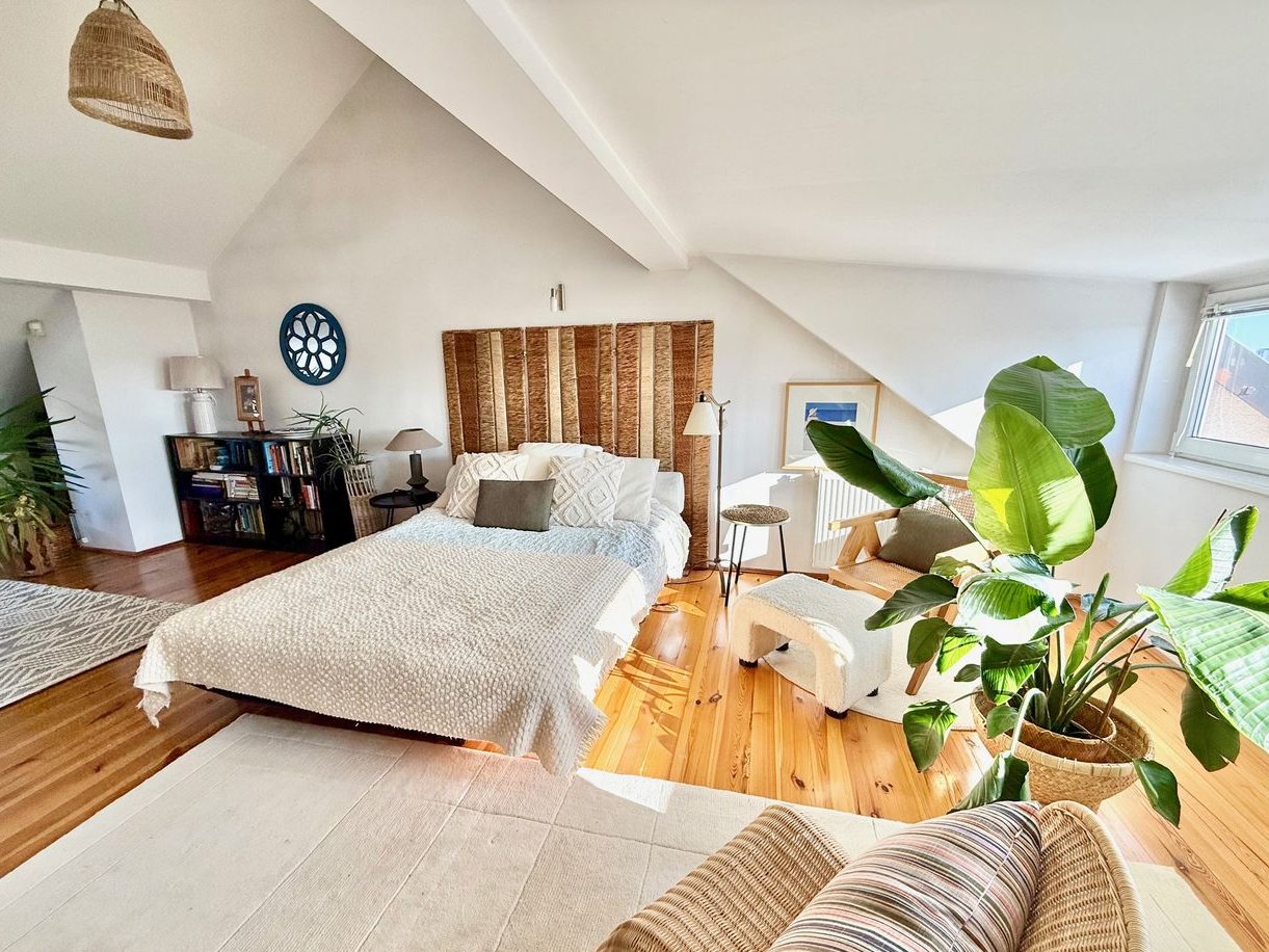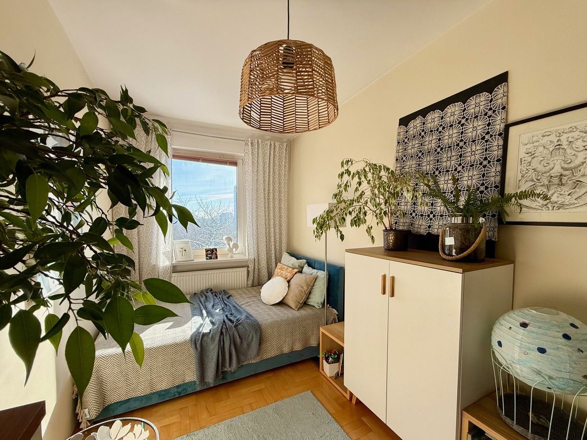 Duża, otwarta przestrzeń pełniąca obecnie funkcję sypialni i garderoby. Można łatwo podzielić ją na 2 pokoje i wygospodarować łazienkę.