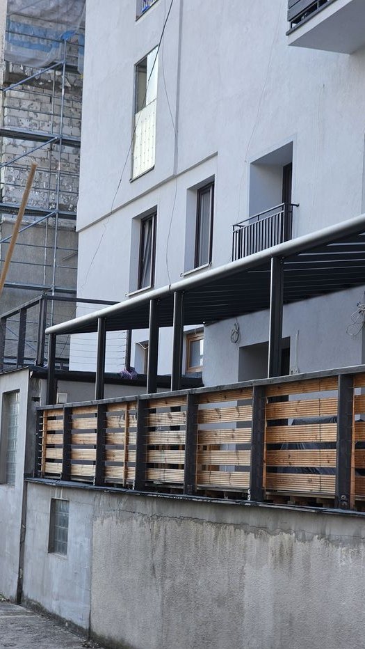 Istniej mozliwość zrobienia zejścia na mały daszek garażu budynku ( daszek ma już balustrady ), co stworzy mozliwość posiadania tarasu ( ok 12 m2 ) .