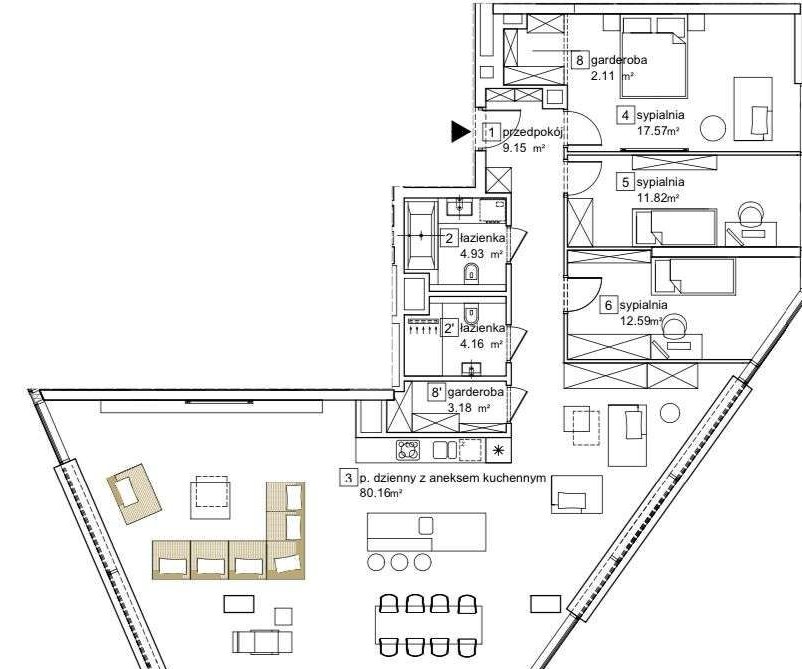 Apartament o powierzchni 146,57 m² to przestronna i funkcjonalna przestrzeń, w skład której wchodzą: