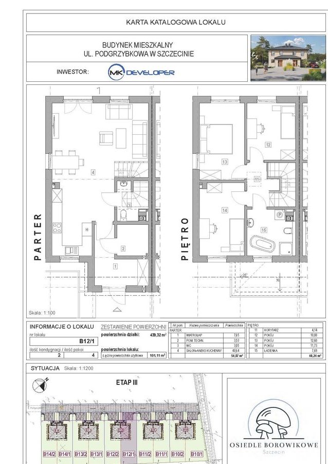 Oferta dotyczy budynku jednorodzinnego w zabudowie bliźniaczej zlokalizowanego na Osiedlu Borowikowym oznaczonego na planie zagospodarowania literą B12/1 o powierzchni użytkowej 101,11 m2, na dużej działce o powierzchni 439,32 m2. Dom posiada pełną wysokość bez skosów na piętrze.
