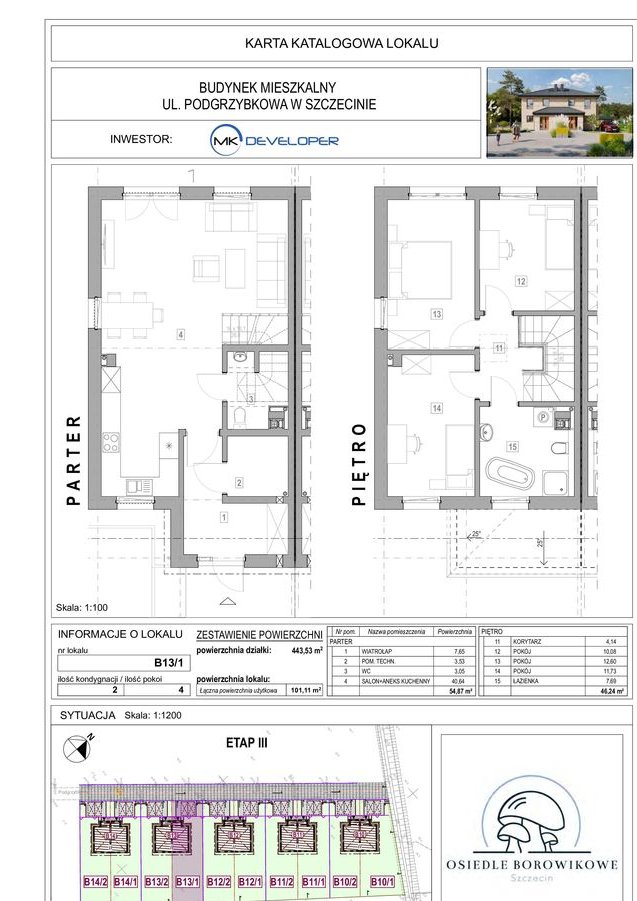 Oferta dotyczy budynku jednorodzinnego w zabudowie bliźniaczej zlokalizowanego na Osiedlu Borowikowym oznaczonego na planie zagospodarowania literą B13/1 o powierzchni użytkowej 101,11 m2, na dużej działce o powierzchni 443,53 m2. Dom posiada pełną wysokość bez skosów na piętrze.