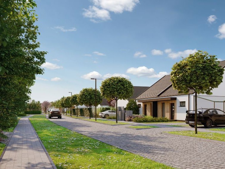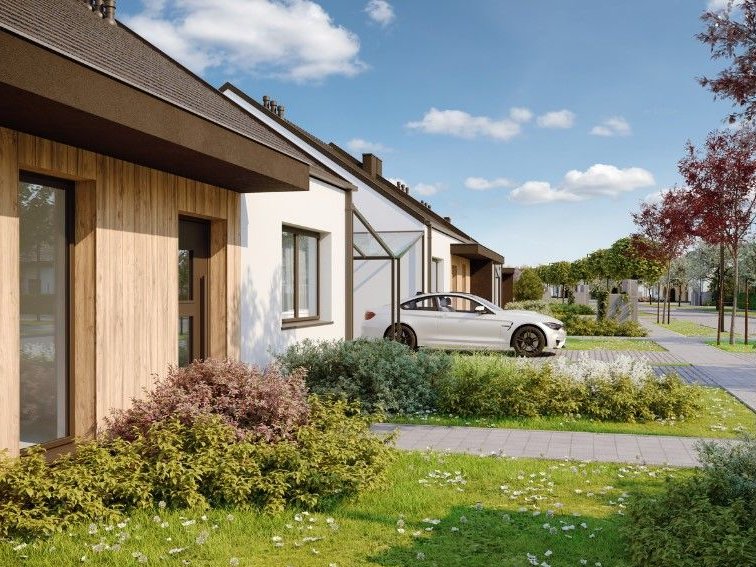 KANVA Classic Plus: Domy o powierzchni ok. 88 m², z dużym salonem, dwiema sypialniami, gabinetem i kuchnią. Każdy dom posiada wiatę garażową.