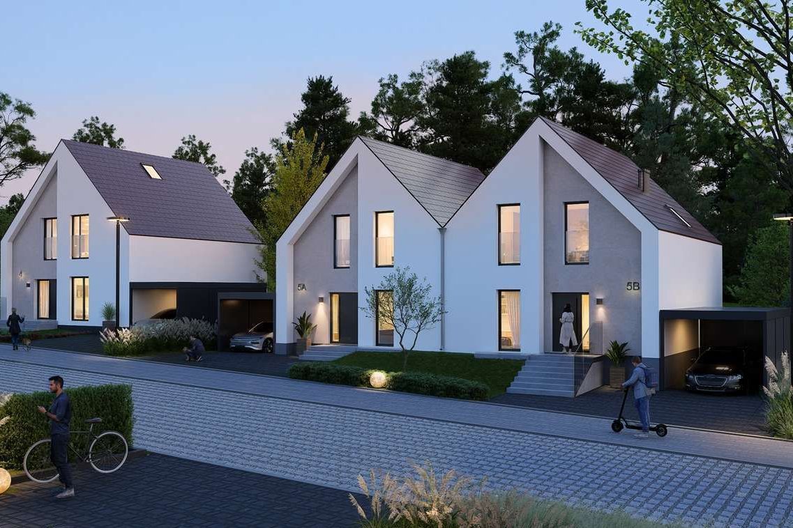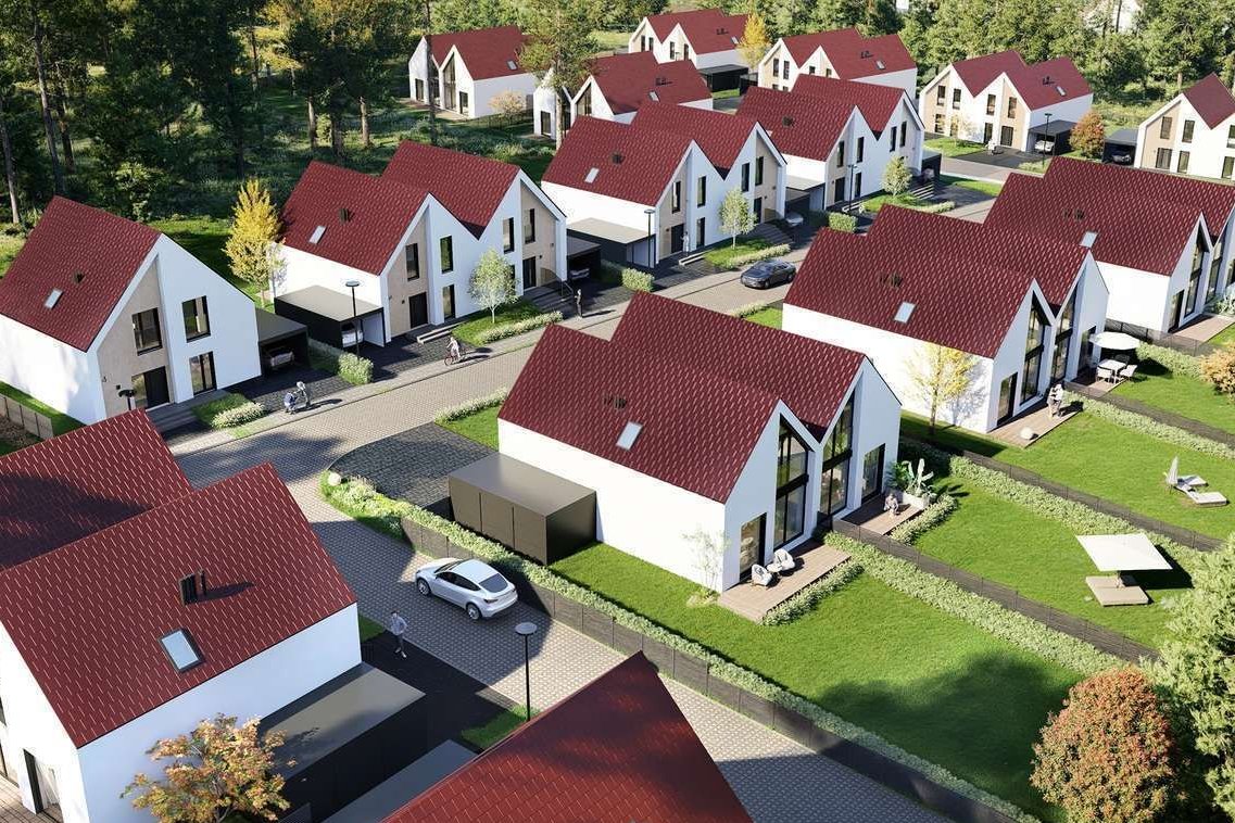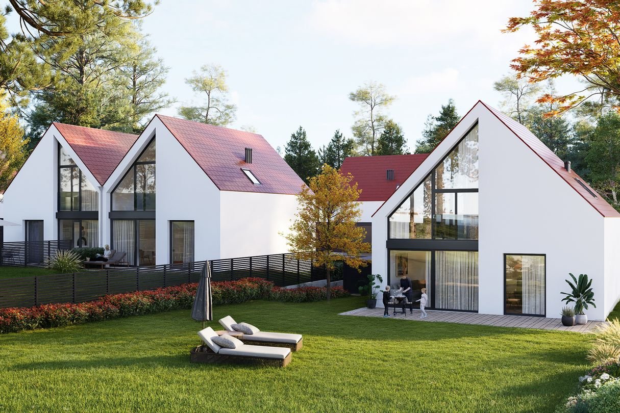 Domy zaprojektowano w duchu nowoczesnej elegancji - prosta forma, duże przeszklenia i jasne wnętrza tworzą harmonijną całość z otoczeniem.