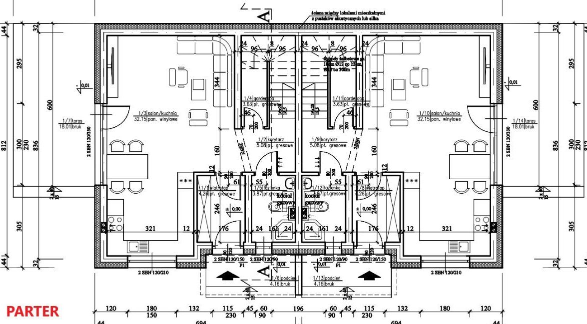 – parter: wiatrołap, korytarz, pokój dzienny z aneksem kuchenny, łazienka, garderoba, klatka schodowa wraz ze schodami