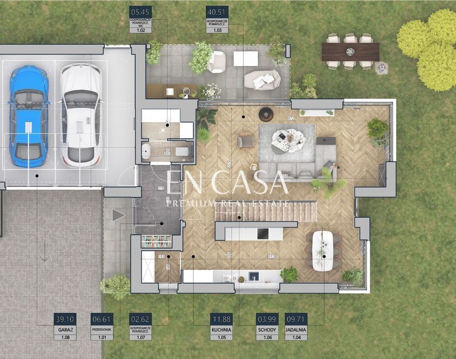 Nowoczesna, otwarta kuchnia z możliwością wydzielenia strefy roboczej oraz pomieszczeniem gospodarczym mogącym stanowić spiżarnie. WC dla gości. Dwustanowiskowy garaż o powierzchni 39 m² z bezpośrednim przejściem do domu.