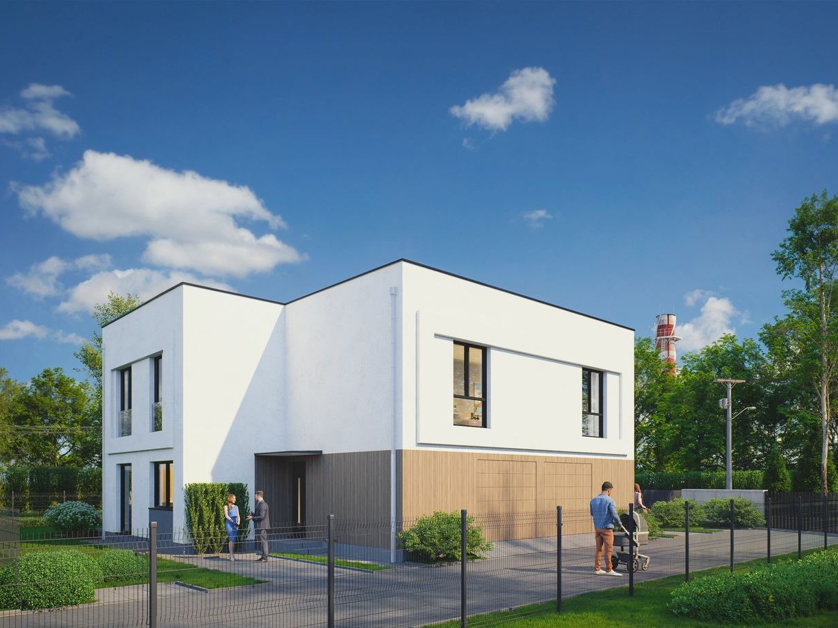Design – wyróżniająca się elewacja zlicowana z bramą garażową sprawia, że całość wygląda elegancko, ponadczasowo i minimalistycznie.