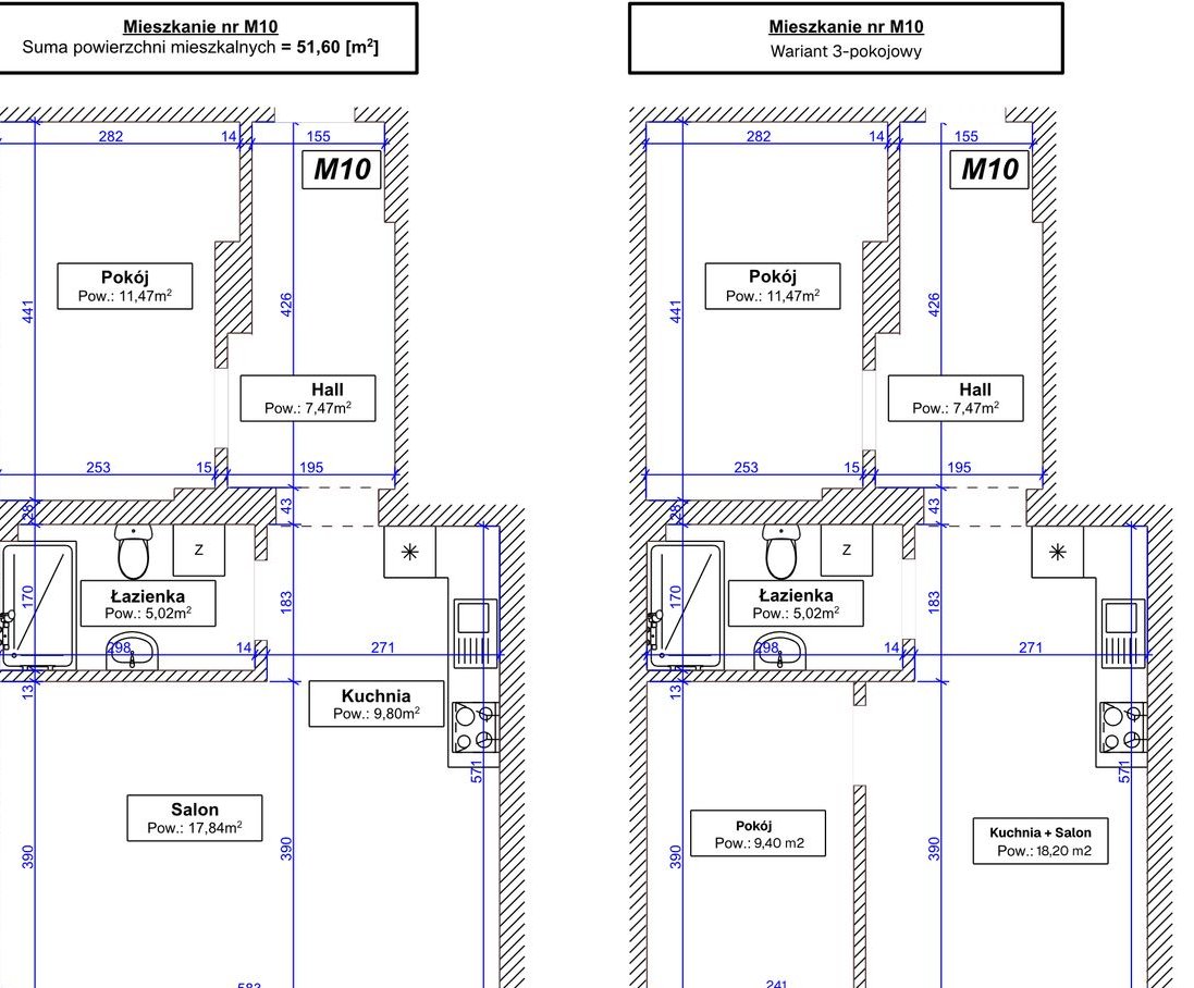 Istnieje możliwość wydzielenia trzeciego pokoju w salonie, dzięki czemu lokal może stać się pełnoprawnym mieszkaniem 3-pokojowym – możemy wykonać taką zmianę bez dodatkowych kosztów.