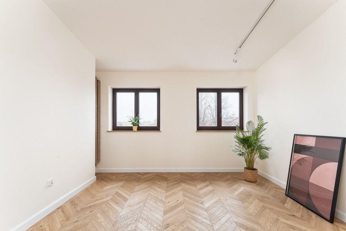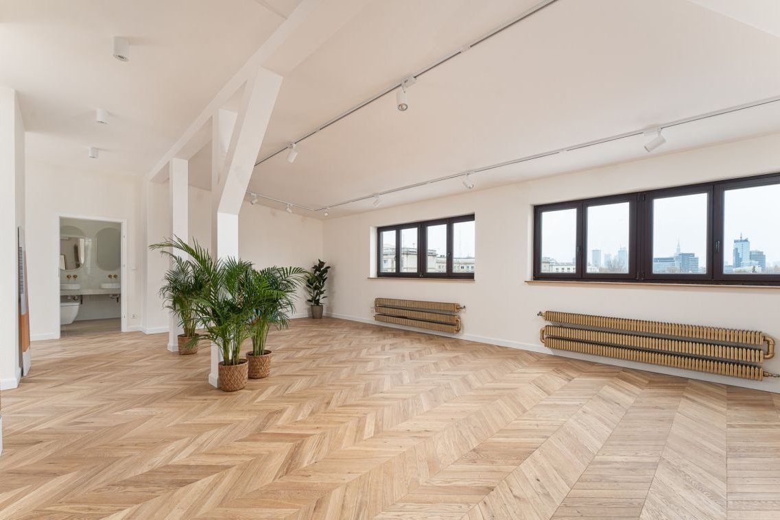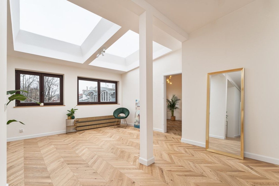 Zakres przeprowadzonych prac remontowych obejmował m. in. wymianę instalacji, prostowanie ścian, renowacja dachu, wymianę świetlików, częściowe wykończenie łazienek, nowe wylewki oraz położenie pięknego parkietu dębowego w jodełkę.